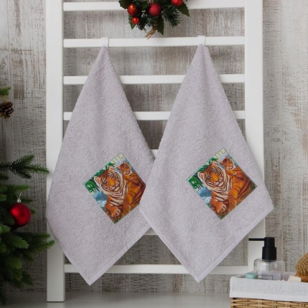 Новогодние полотенца (подарочный набор 2 шт.) Королева джунглей 40х70см, бежевый, хлопок 100%, 400г/м2