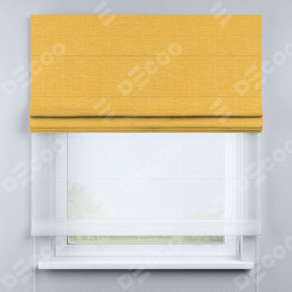 Римская штора день-ночь производителя «Cortin», используется для проёма, пошита из двух полотен, с лицевой стороны лён жёлтый артикул 63738, вторая ткань тюль (по стандарту комплектуется тюль белого цвета артикул V-01). Имеет универсальный механизм и подходит для монтажа: на потолок, на стену и в нишу.