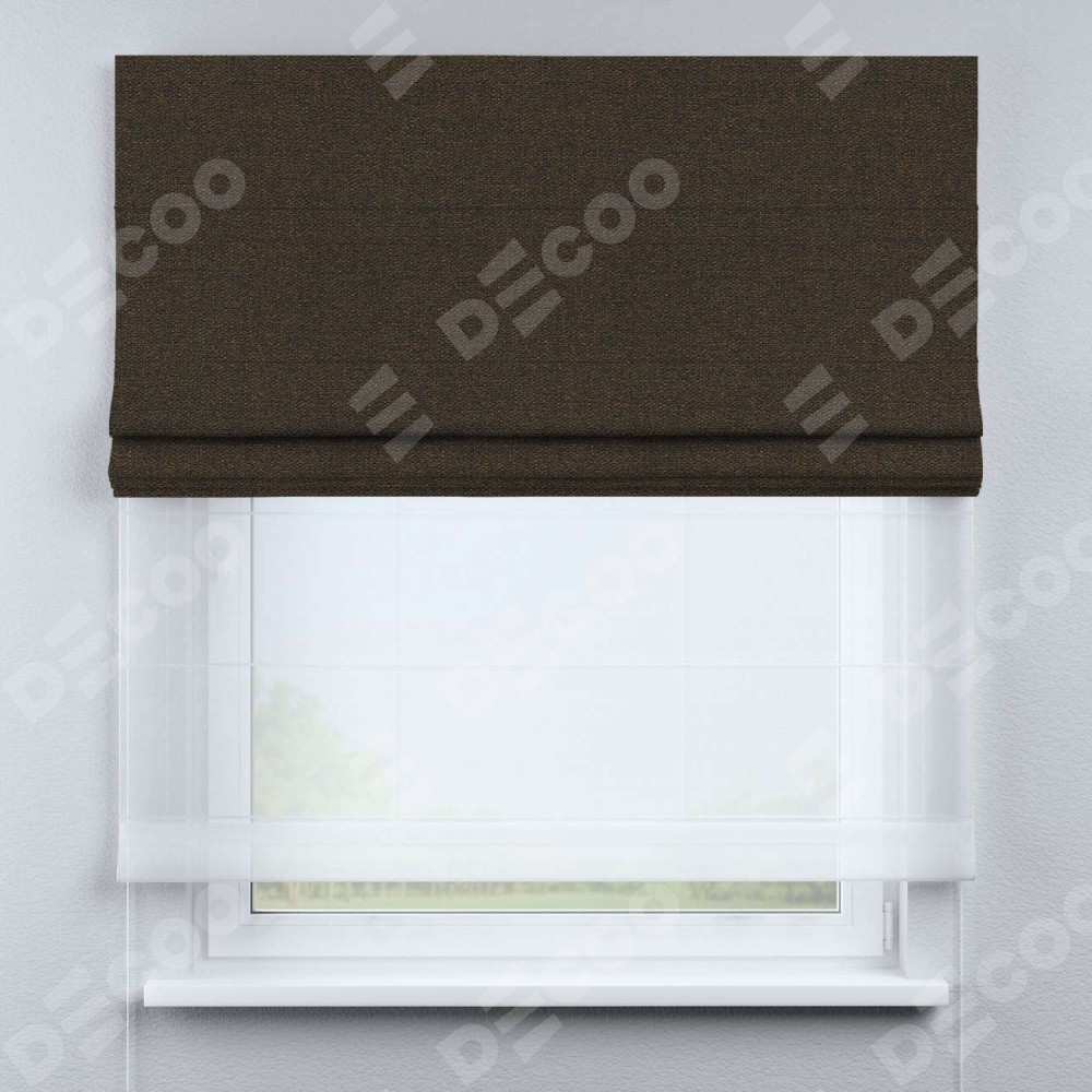 Римская штора день-ночь производителя «Cortin», используется для проёма, пошита из двух полотен, с лицевой стороны лён тёмно-коричневый артикул 53444, вторая ткань тюль (по стандарту комплектуется тюль белого цвета артикул V-01). Имеет универсальный механизм и подходит для монтажа: на потолок, на стену и в нишу.