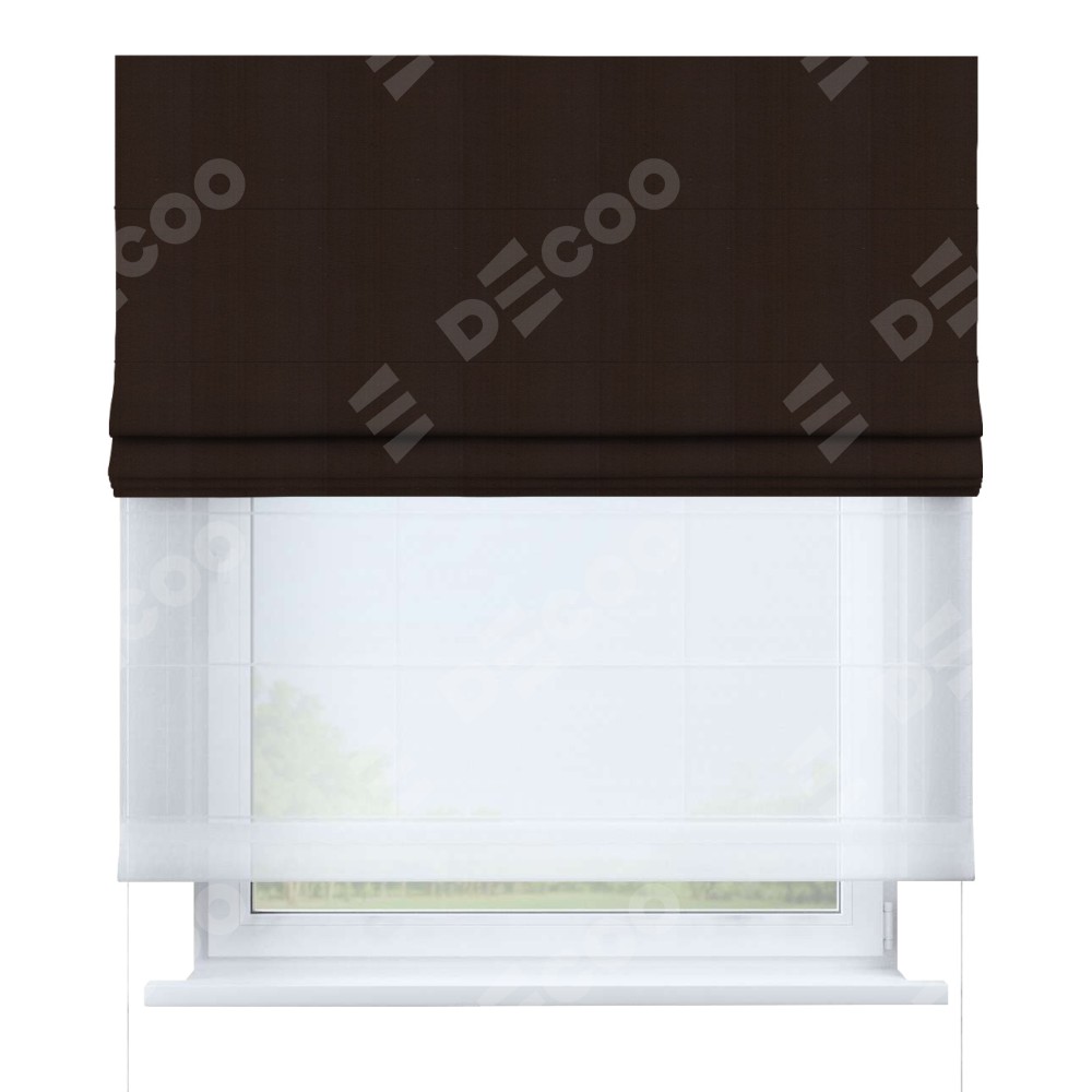 Римская штора день-ночь производителя «Cortin», используется для проёма, пошита из двух полотен, с лицевой стороны блэкаут однотонный тёмно-коричневый артикул 88287, вторая ткань тюль (по стандарту комплектуется тюль белого цвета артикул V-01). Имеет универсальный механизм и подходит для монтажа: на потолок, на стену и в нишу.