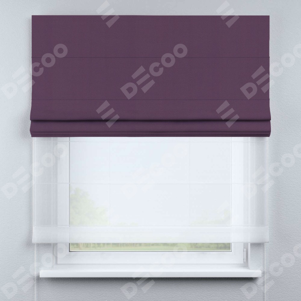 Римская штора день-ночь производителя «Cortin», используется для проёма, пошита из двух полотен, с лицевой стороны блэкаут однотонный фуксия артикул 88303, вторая ткань тюль (по стандарту комплектуется тюль белого цвета артикул V-01). Имеет универсальный механизм и подходит для монтажа: на потолок, на стену и в нишу.