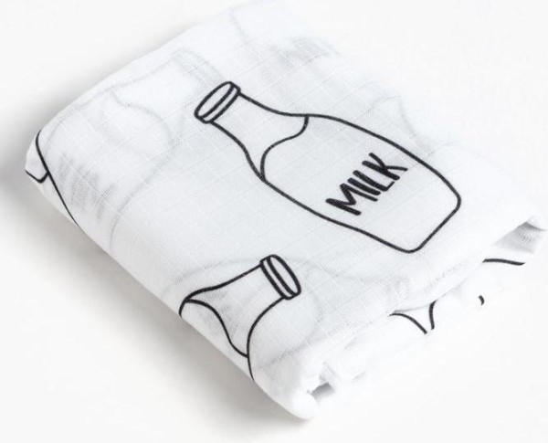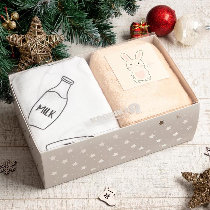 В набор входит плед 90 × 90 см и муслиновая пелёнка 75 × 120 см.