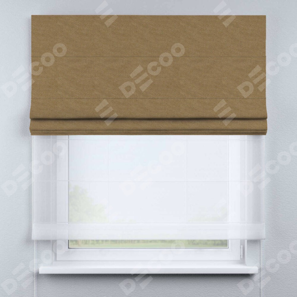 Римская штора день-ночь производителя «Cortin», используется для проёма, пошита из двух полотен, с лицевой стороны лён димаут коричневый артикул 83026, вторая ткань тюль (по стандарту комплектуется тюль белого цвета артикул V-01). Имеет универсальный механизм и подходит для монтажа: на потолок, на стену и в нишу.