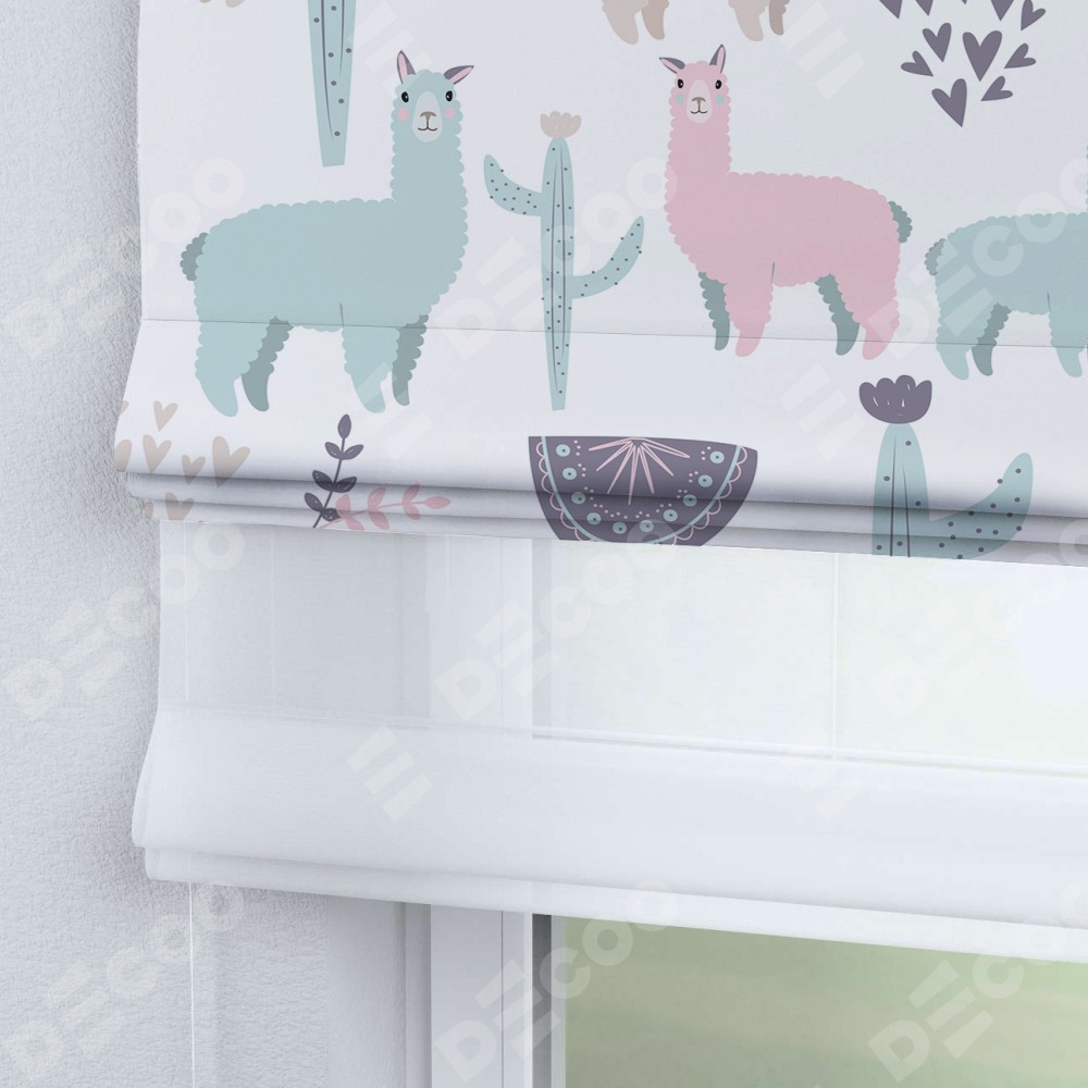 Римская штора день-ночь производителя «Cortin», используется для проёма, пошита из двух полотен, с лицевой блэкаут с нанесением сублимационной печати «Милый лама», вторая ткань тюль (по стандарту комплектуется тюль белого цвета артикул V-01). Имеет универсальный механизм и подходит для монтажа: на потолок, на стену и в нишу.