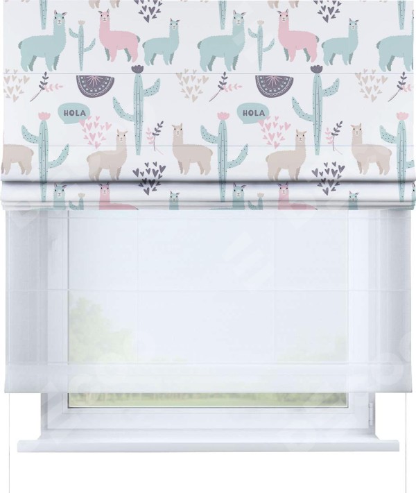 Римская штора день-ночь производителя «Cortin», используется для проёма, пошита из двух полотен, с лицевой блэкаут с нанесением сублимационной печати «Милый лама», вторая ткань тюль (по стандарту комплектуется тюль белого цвета артикул V-01). Имеет универсальный механизм и подходит для монтажа: на потолок, на стену и в нишу.