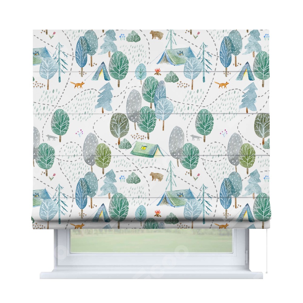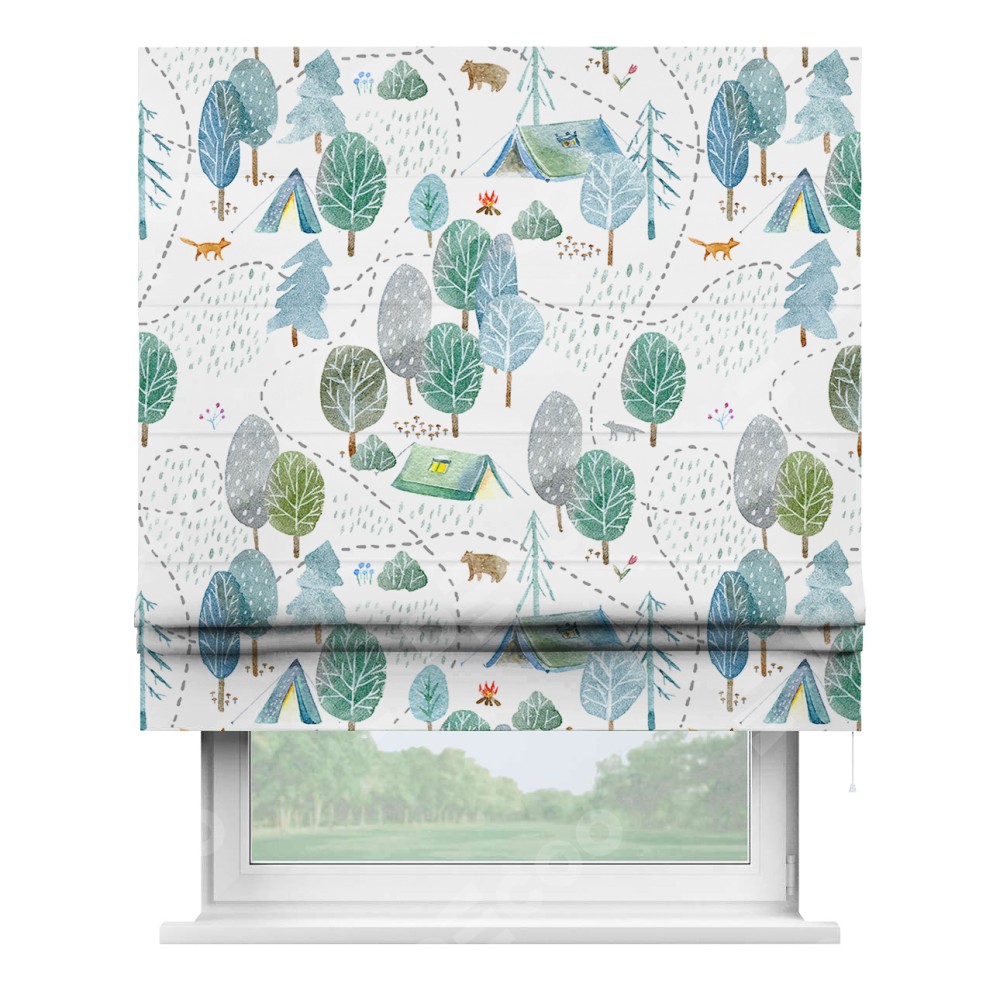 Римская штора производителя «Cortin», используется для проёма, пошита из ткани блэкаут с нанесением сублимационной печати «Лесистая местность». Имеет универсальный механизм и подходит для монтажа: на потолок, на стену и в нишу.