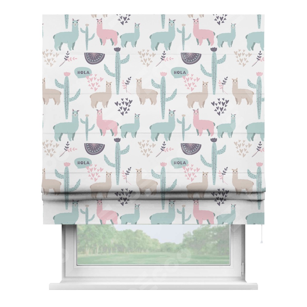 Римская штора производителя «Cortin», используется для проёма, пошита из ткани блэкаут с нанесением сублимационной печати «Милый лама». Имеет универсальный механизм и подходит для монтажа: на потолок, на стену и в нишу.