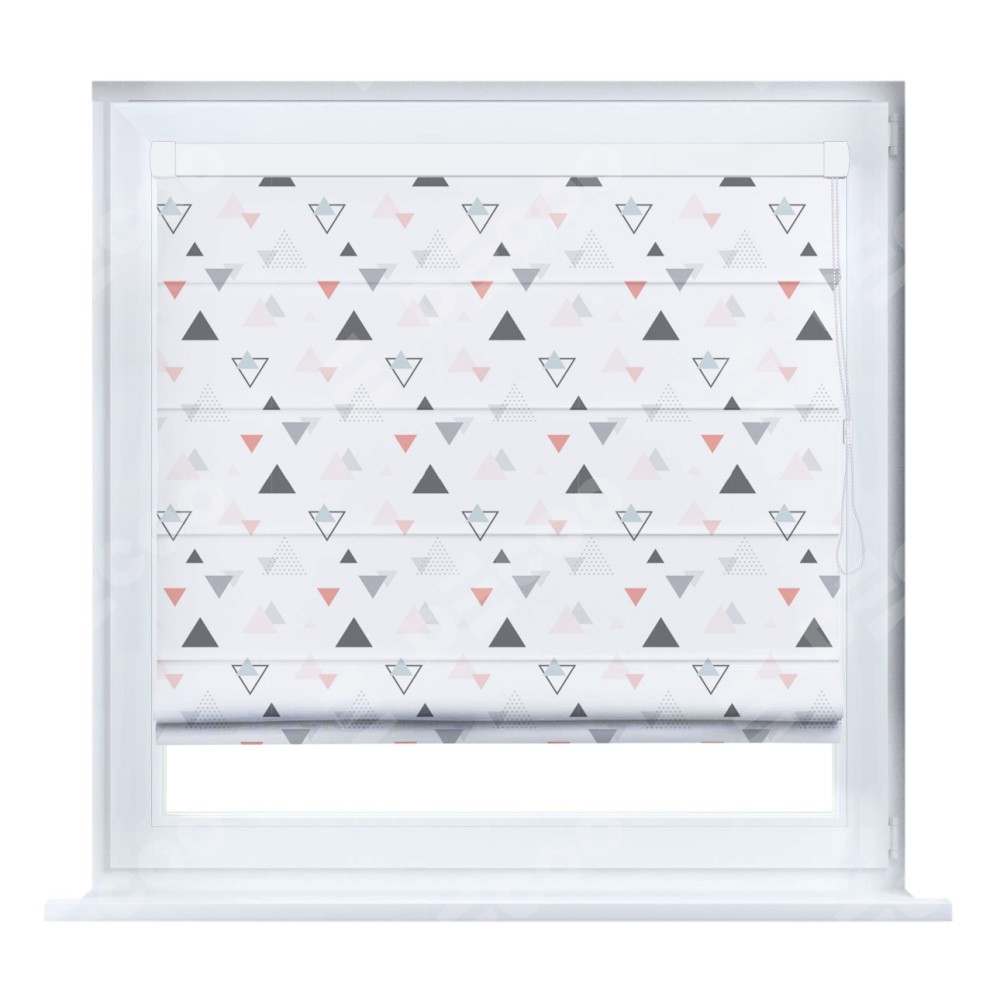 Римская штора кассетного типа, производителя «Cortin», устанавливается только на пластиковые окна и прилегает к стеклопакету, пошита из ткани блэкаут с нанесением сублимационной печати «Дождь из треугольников».