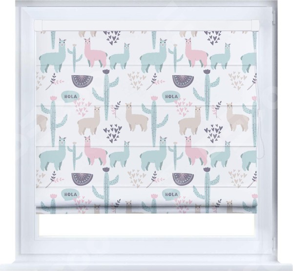 Римская штора производителя «Cortin», устанавливается на створку окна, пошита из ткани блэкаут с нанесением сублимационной печати «Милый лама». Штора шьётся по индивидуальным размерам, для данного типа римской шторы возможная ширина от 35 до 150 см., высота до 250 см.