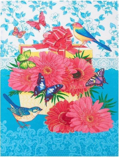 Полотенце в коробке 45×60 см, Герберы, бирюза, вафля, 160 гр/м2, хлопок 100%