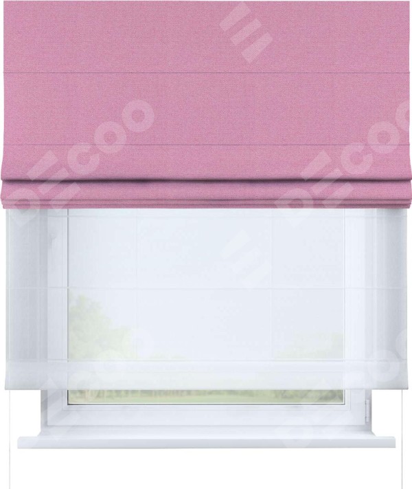 Римская штора день-ночь производителя «Cortin», используется для проёма, пошита из двух полотен, с лицевой стороны лён димаут розовый артикул 16257, вторая ткань тюль (по стандарту комплектуется тюль белого цвета артикул V-01). Имеет универсальный механизм и подходит для монтажа: на потолок, на стену и в нишу.