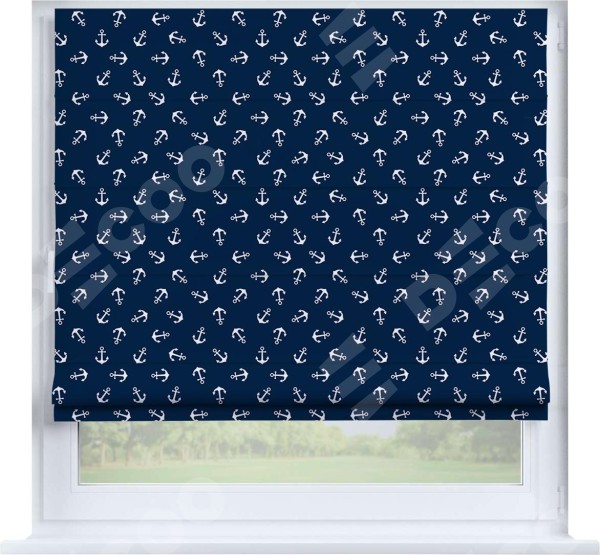 Римская штора производителя «Cortin», устанавливается на створку окна, пошита из ткани блэкаут с нанесением сублимационной печати «Морские якори». Штора шьётся по индивидуальным размерам, для данного типа римской шторы возможная ширина от 35 до 150 см., высота до 250 см.
