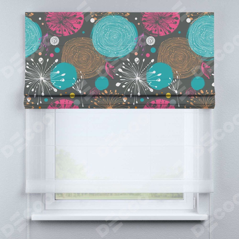 Римская штора день-ночь производителя «Cortin», используется для проёма, пошита из двух полотен, с лицевой блэкаут с нанесением сублимационной печати «Милый гранж», вторая ткань тюль (по стандарту комплектуется тюль белого цвета артикул V-01). Имеет универсальный механизм и подходит для монтажа: на потолок, на стену и в нишу.