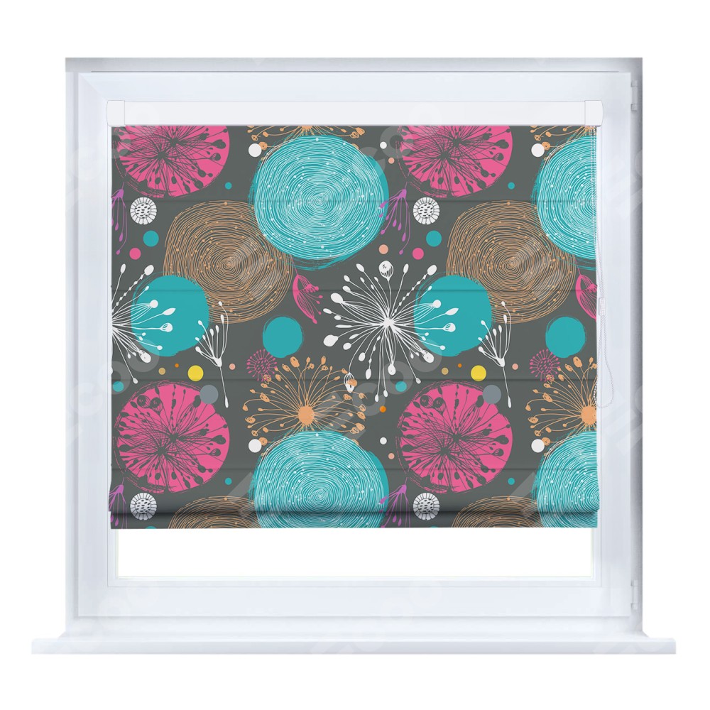 Римская штора кассетного типа, производителя «Cortin», устанавливается только на пластиковые окна и прилегает к стеклопакету, пошита из ткани блэкаут с нанесением сублимационной печати «Милый гранж».