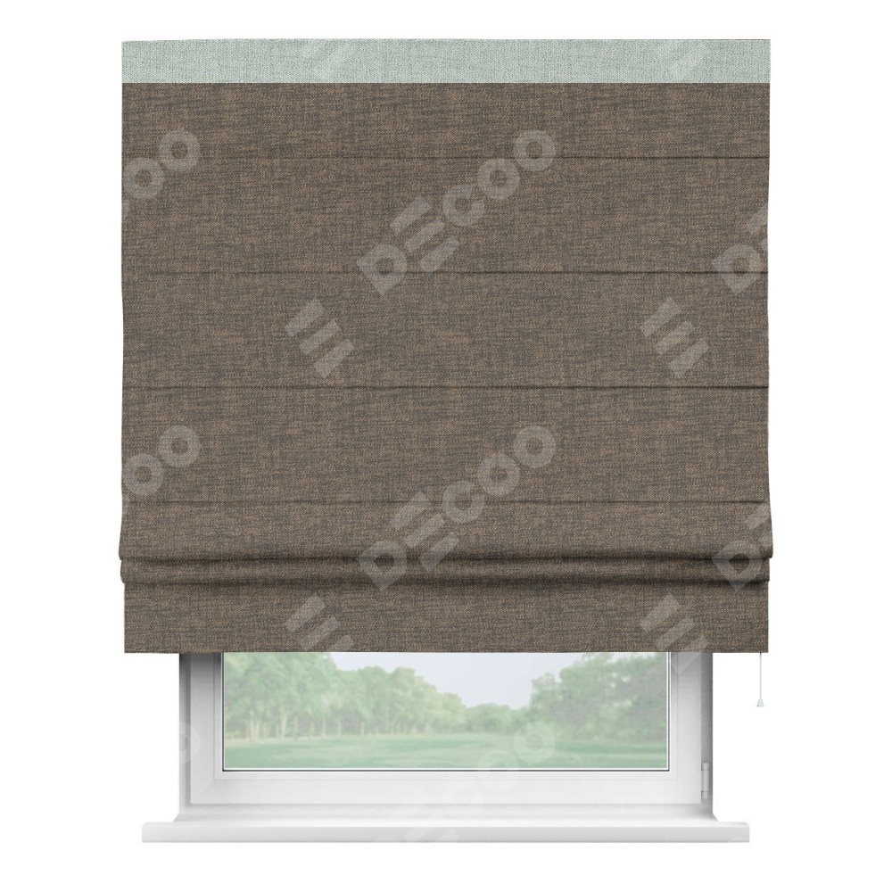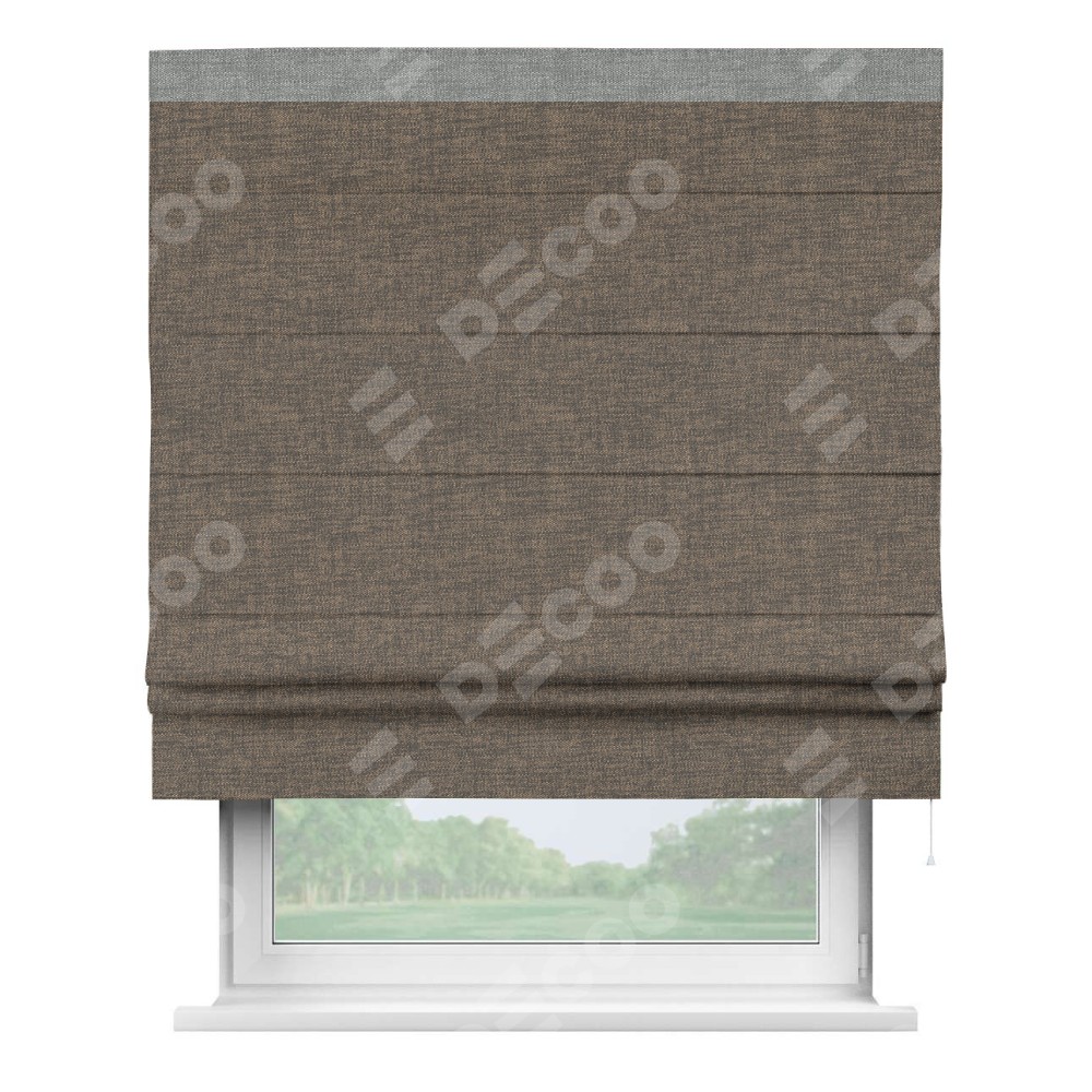 Римская штора производителя «Cortin», используется для проёма, пошита из ткани рогожка димаут коричневый, артикул 80420. Отделка шторы кантом «Кинг», ткань для канта используется из рогожки димаут разной расцветки на выбор. Имеет универсальный механизм и подходит для монтажа: на потолок, на стену и в нишу.