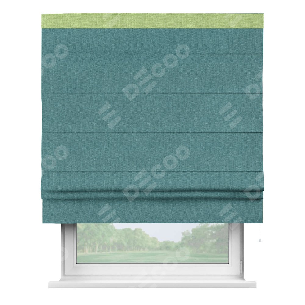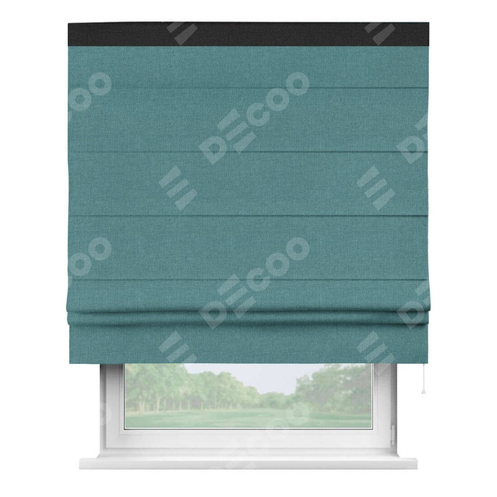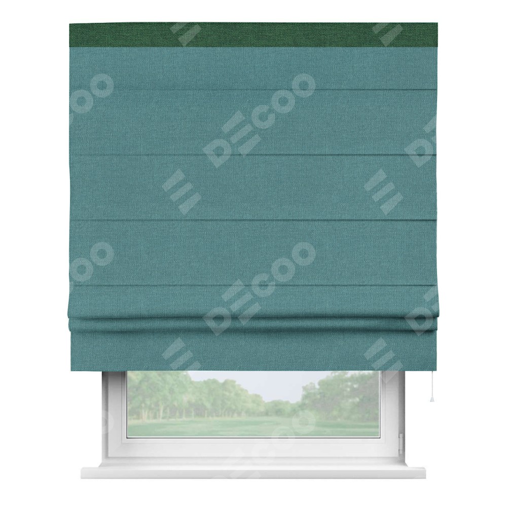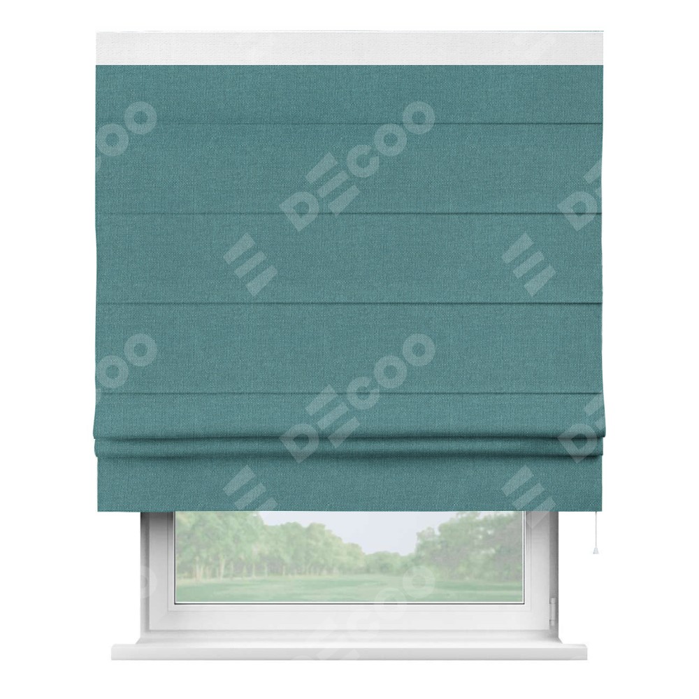 Римская штора производителя «Cortin», используется для проёма, пошита из ткани лён бирюзовый, артикул 53436. Отделка шторы кантом «Кинг», ткань для канта используется из льна разной расцветки на выбор. Имеет универсальный механизм и подходит для монтажа: на потолок, на стену и в нишу.