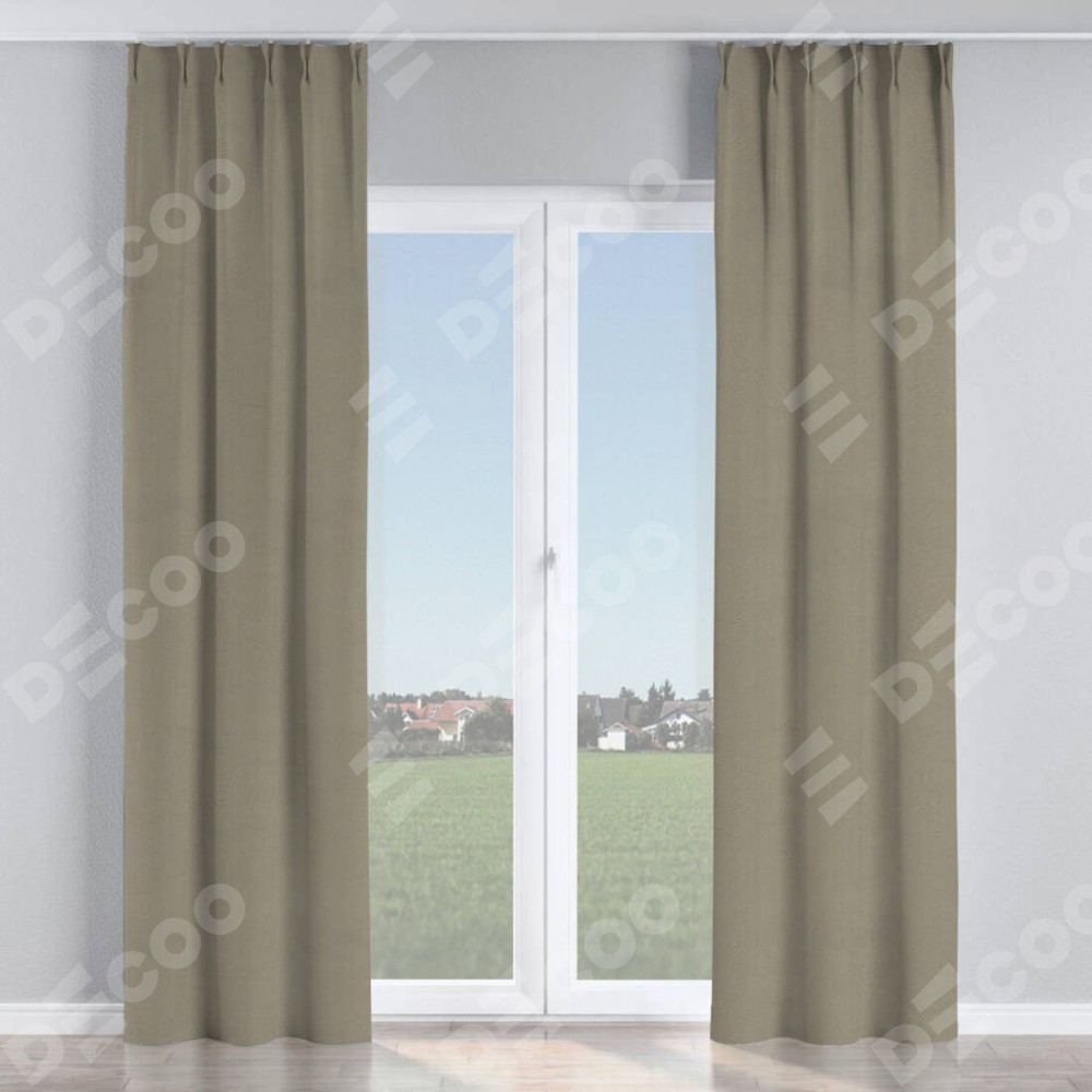 Комплект прямых штор, от производителя «Cortin», пошиты из ткани блэкаут однотонный бежево-серый, артикул ткани 00004. С изнаночной стороны в верхней части штор пристрачивается шторная лента с декоративными складками «Кустик». Для создания элегантных складок прямые шторы шьются по стандарту с коэффициентом 1:2 (на 100 см. ширины проёма 200 см. ширины ткани).