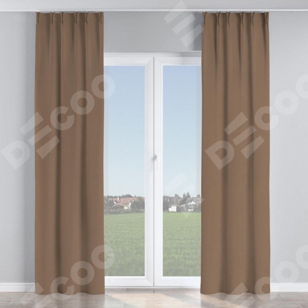 Комплект прямых штор, от производителя «Cortin», пошиты из ткани блэкаут однотонный коричневый, артикул ткани 88285. С изнаночной стороны в верхней части штор пристрачивается шторная лента с декоративными складками «Кустик». Для создания элегантных складок прямые шторы шьются по стандарту с коэффициентом 1:2 (на 100 см. ширины проёма 200 см. ширины ткани).