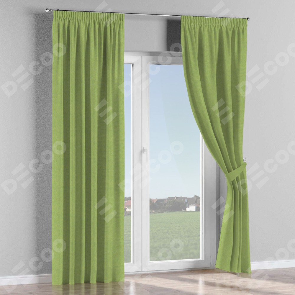 Комплект прямых штор, от производителя «Cortin», пошиты из ткани лён димаут салатовый, артикул ткани 83032. С изнаночной стороны в верхней части штор пристрачивается шторная лента с декоративными складками «Карандаш». Для создания элегантных складок прямые шторы шьются по стандарту с коэффициентом 1:2 (на 100 см. ширины проёма 200 см. ширины ткани).