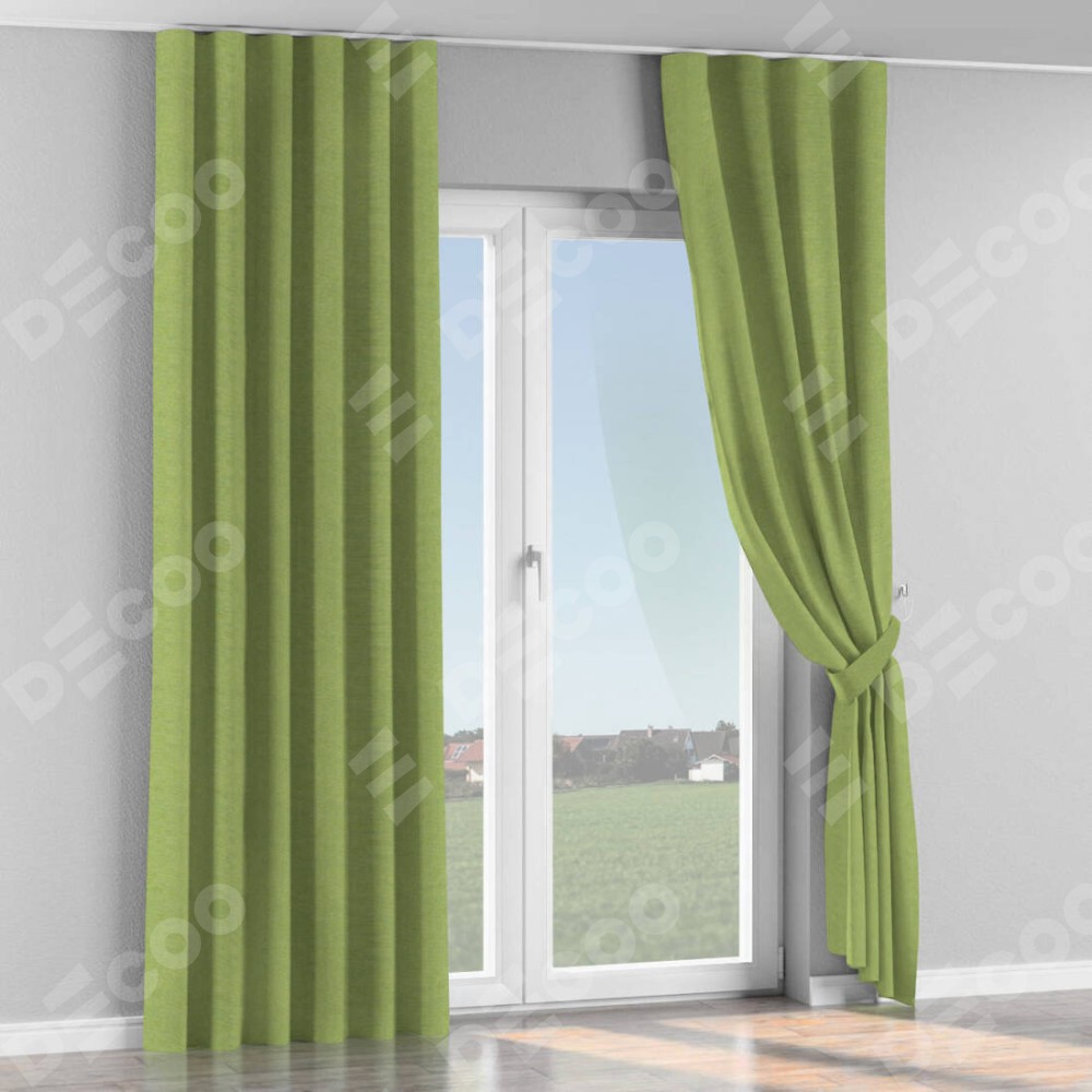 Комплект прямых штор, от производителя «Cortin», пошиты из ткани лён димаут салатовый, артикул ткани 83032. С изнаночной стороны в верхней части штор пристрачивается шторная лента с декоративными складками «Волна». Для создания элегантных складок прямые шторы шьются по стандарту с коэффициентом 1:2 (на 100 см. ширины проёма 200 см. ширины ткани).