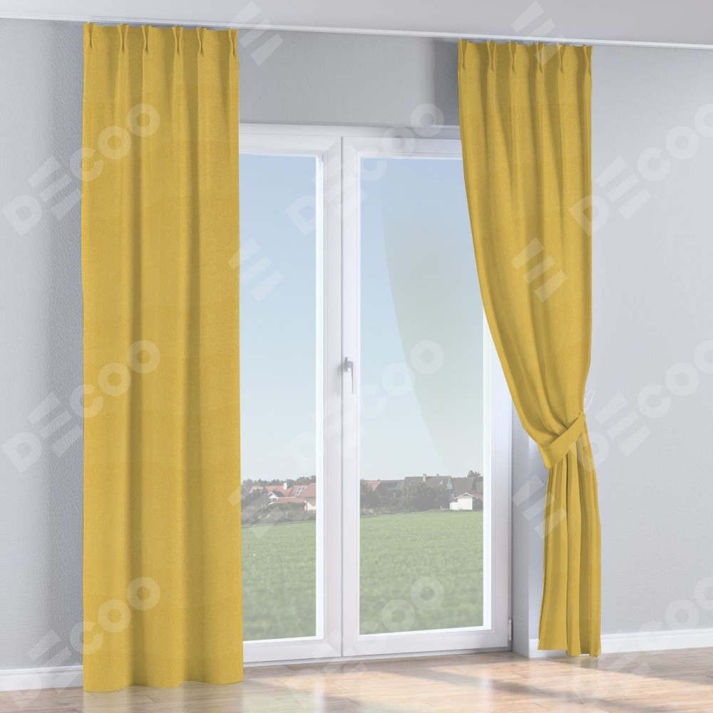 Комплект прямых штор, от производителя «Cortin», пошиты из ткани твид блэкаут пыльная горчица, артикул ткани 21588. С изнаночной стороны в верхней части штор пристрачивается шторная лента с декоративными складками «Кустик». Для создания элегантных складок прямые шторы шьются по стандарту с коэффициентом 1:2 (на 100 см. ширины проёма 200 см. ширины ткани).