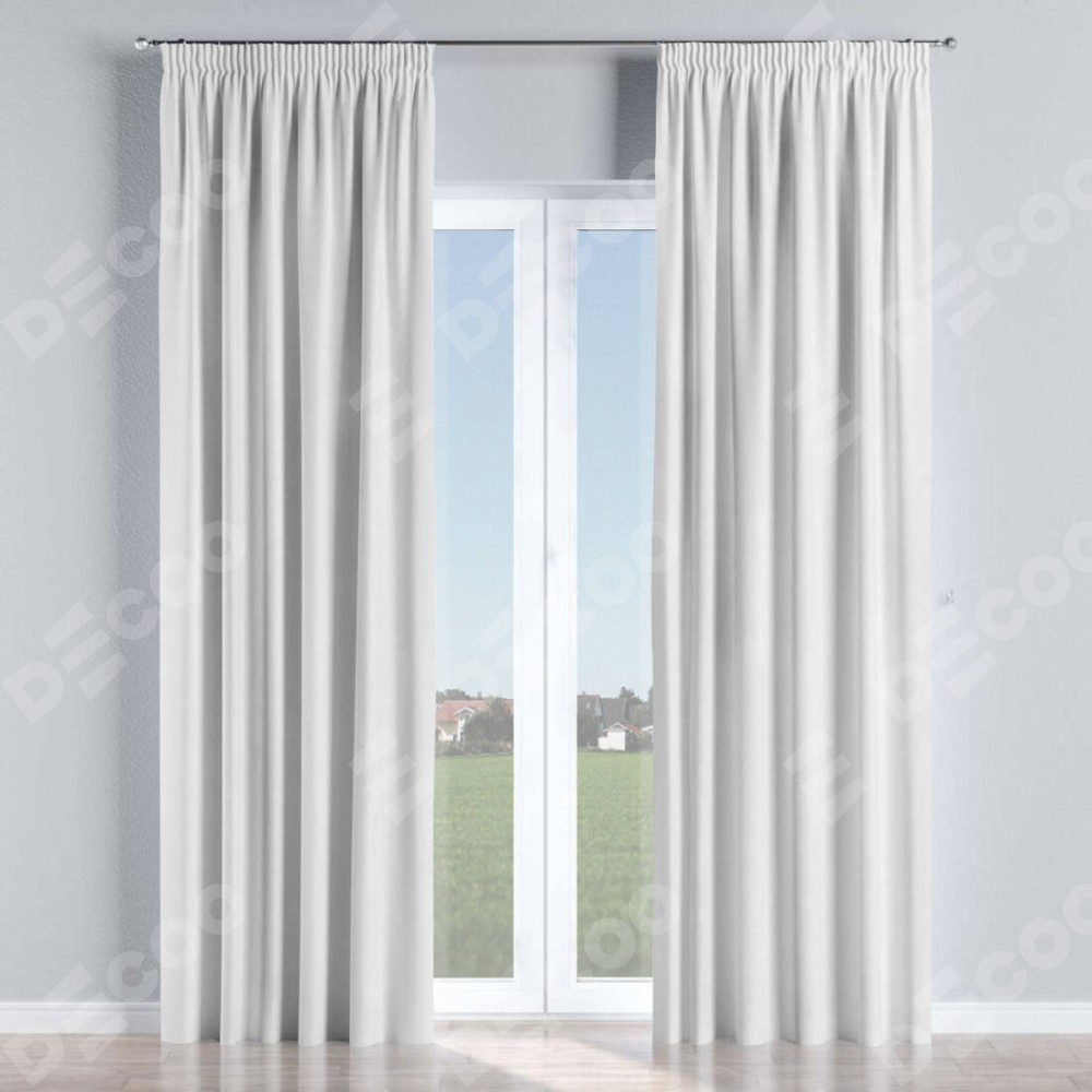 Комплект прямых штор, от производителя «Cortin», пошиты из ткани вельвет дымчато-белый, артикул ткани 85535. С изнаночной стороны в верхней части штор пристрачивается шторная лента с декоративными складками «Карандаш». Для создания элегантных складок прямые шторы шьются по стандарту с коэффициентом 1:2 (на 100 см. ширины проёма 200 см. ширины ткани).