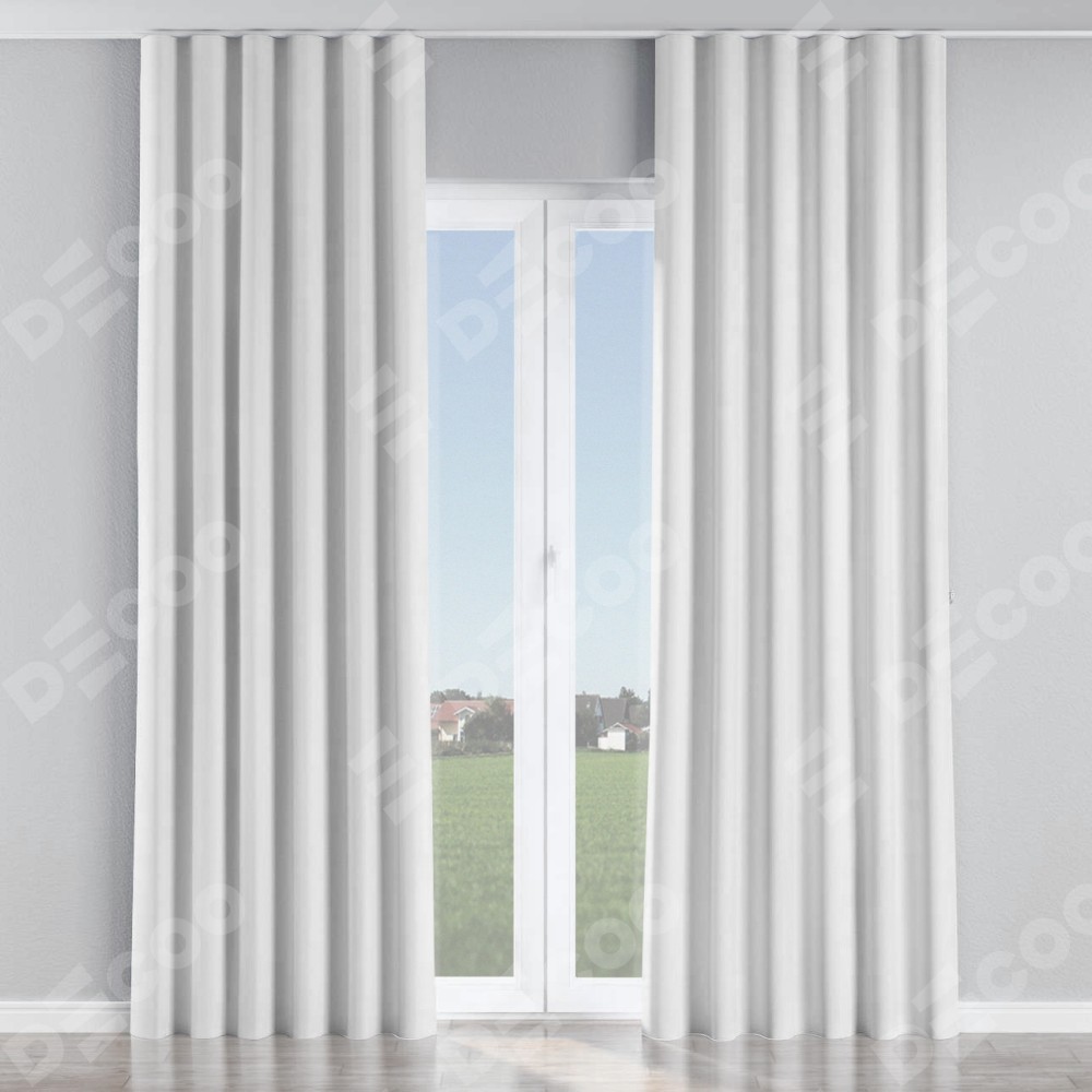 Комплект прямых штор, от производителя «Cortin», пошиты из ткани вельвет дымчато-белый, артикул ткани 85535. С изнаночной стороны в верхней части штор пристрачивается шторная лента с декоративными складками «Волна». Для создания элегантных складок прямые шторы шьются по стандарту с коэффициентом 1:2 (на 100 см. ширины проёма 200 см. ширины ткани).