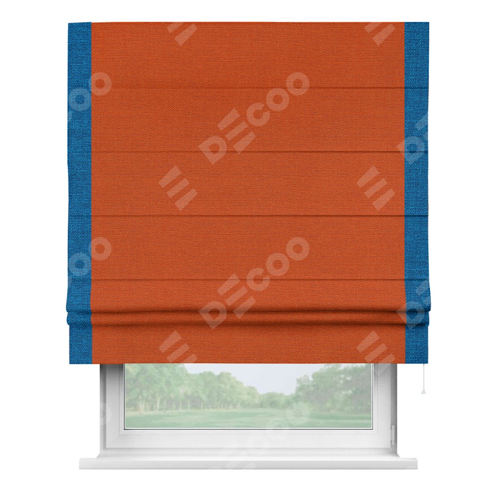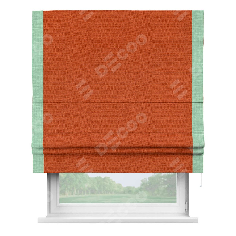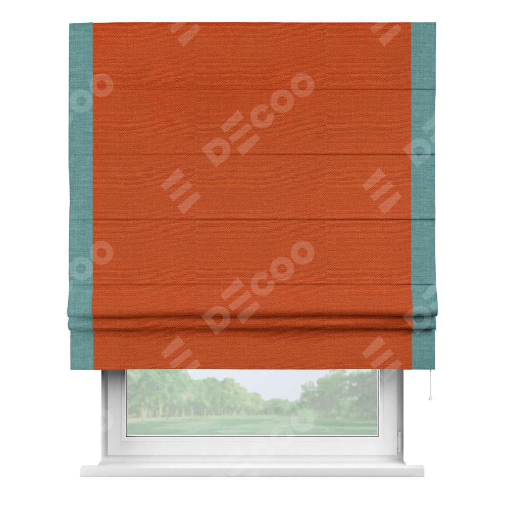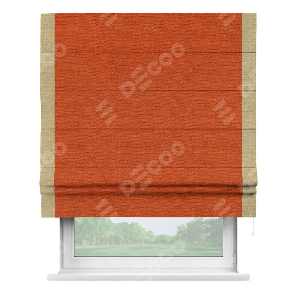 Римская штора производителя «Cortin», используется для проёма, пошита из ткани лён терракотовый, артикул 53440. Отделка шторы кантом «Стрим Дуо», ткань для канта используется из льна разной расцветки на выбор. Имеет универсальный механизм и подходит для монтажа: на потолок, на стену и в нишу.