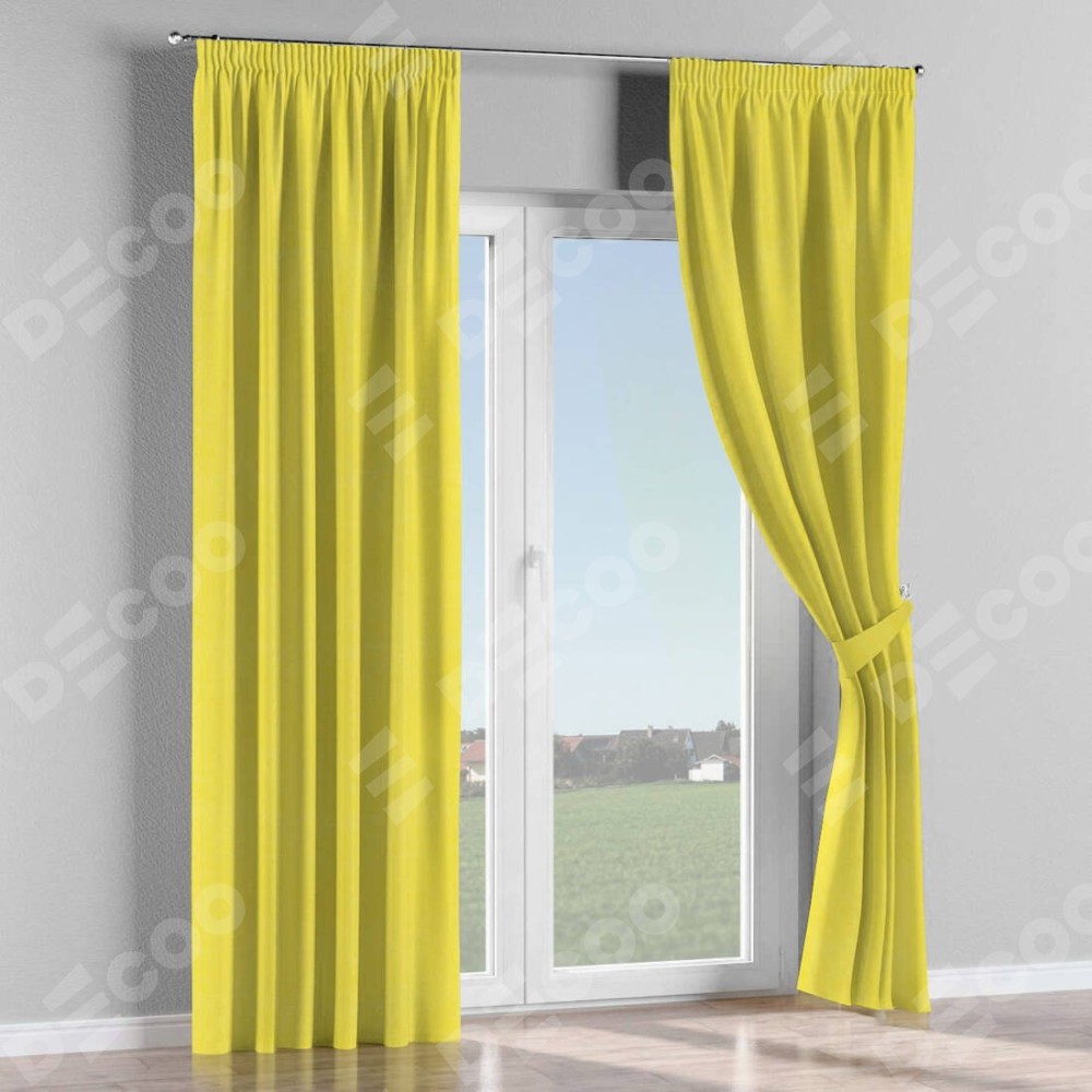 Комплект прямых штор, от производителя «Cortin», пошиты из ткани вельвет светло-желтый, артикул ткани 30997. С изнаночной стороны в верхней части штор пристрачивается шторная лента с декоративными складками «Карандаш». Для создания элегантных складок прямые шторы шьются по стандарту с коэффициентом 1:2 (на 100 см. ширины проёма 200 см. ширины ткани).
