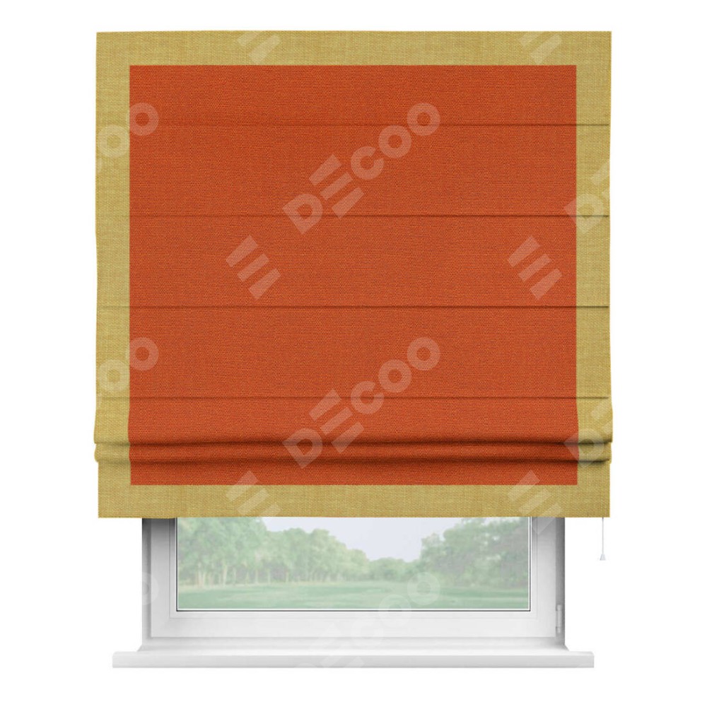 Римская штора производителя «Cortin», используется для проёма, пошита из ткани лён терракотовый, артикул 53440. Отделка шторы кантом «Чесс», ткань для канта используется из льна разной расцветки на выбор. Имеет универсальный механизм и подходит для монтажа: на потолок, на стену и в нишу.