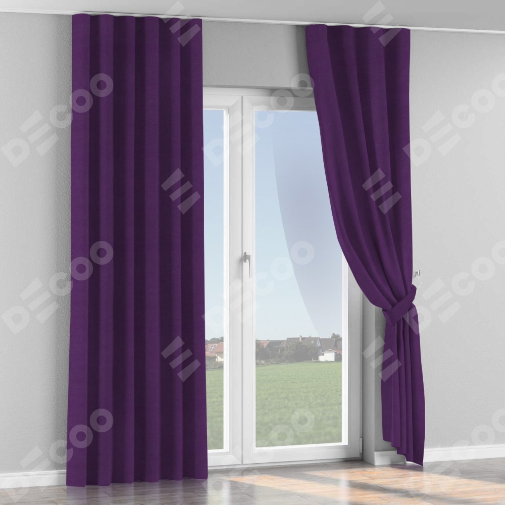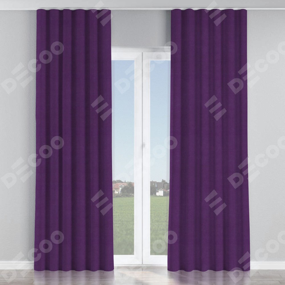 Комплект прямых штор, от производителя «Cortin», пошиты из ткани вельвет тёмно-фиолетовый, артикул ткани 17753. С изнаночной стороны в верхней части штор пристрачивается шторная лента с декоративными складками «Волна». Для создания элегантных складок прямые шторы шьются по стандарту с коэффициентом 1:2 (на 100 см. ширины проёма 200 см. ширины ткани).