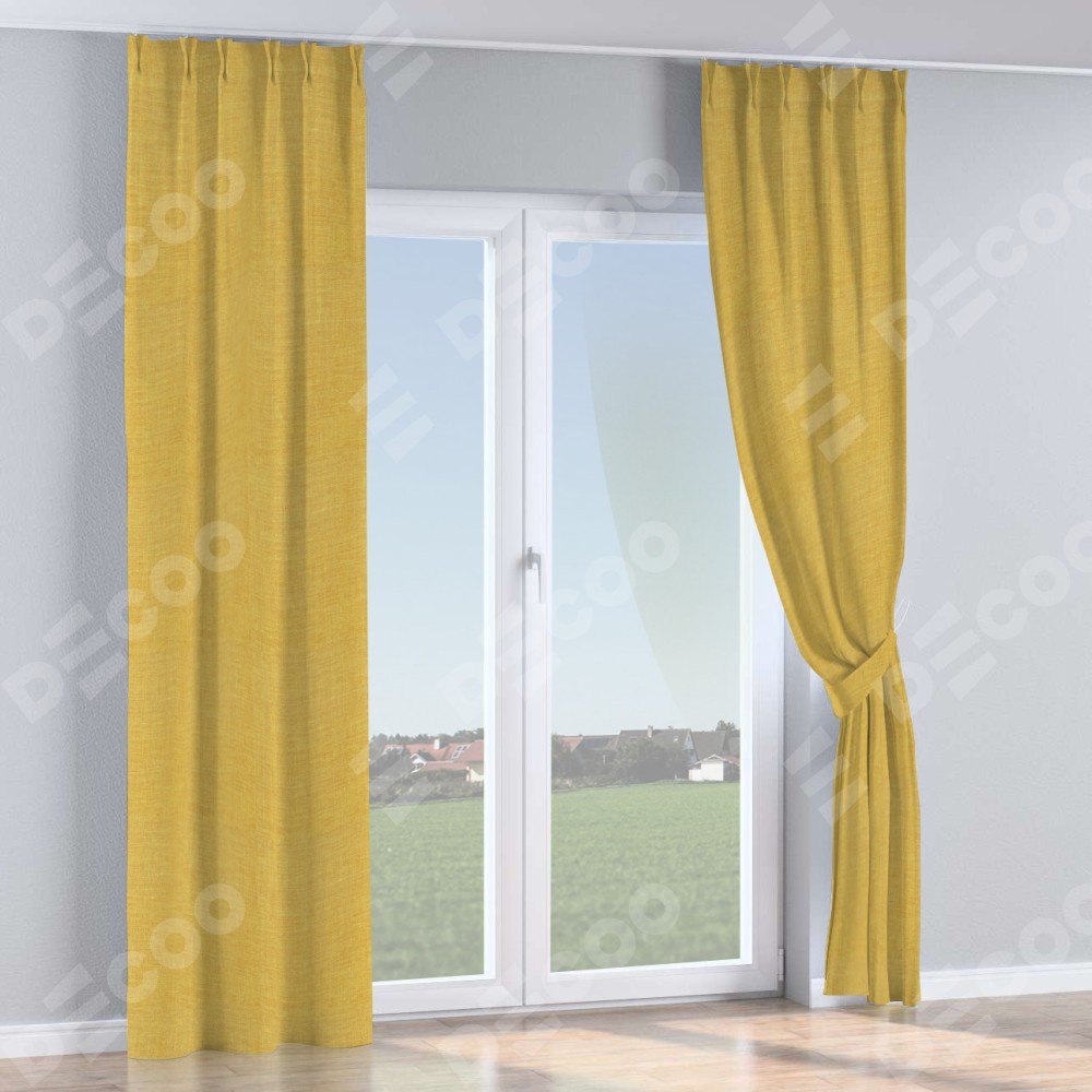 Комплект прямых штор, от производителя «Cortin», пошиты из ткани лён горчичный, артикул ткани 74740. С изнаночной стороны в верхней части штор пристрачивается шторная лента с декоративными складками «Кустик». Для создания элегантных складок прямые шторы шьются по стандарту с коэффициентом 1:2 (на 100 см. ширины проёма 200 см. ширины ткани).