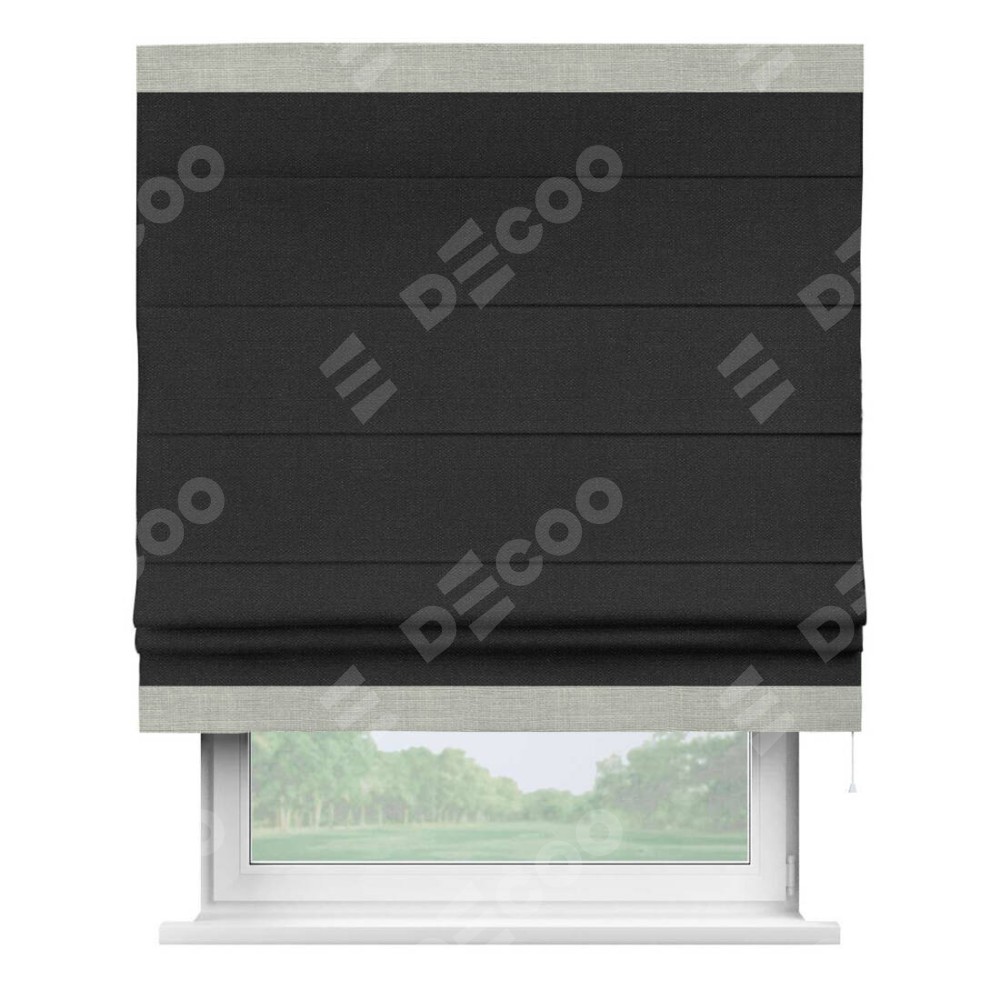 Римская штора производителя «Cortin», используется для проёма, пошита из ткани лён черный, артикул 85927. Отделка шторы кантом «Горизонт», ткань для канта используется из льна разной расцветки на выбор. Имеет универсальный механизм и подходит для монтажа: на потолок, на стену и в нишу.