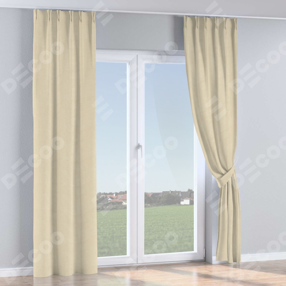 Комплект прямых штор, от производителя «Cortin», пошиты из ткани лён кашемир шампань, артикул ткани 17205. С изнаночной стороны в верхней части штор пристрачивается шторная лента с декоративными складками «Кустик». Для создания элегантных складок прямые шторы шьются по стандарту с коэффициентом 1:2 (на 100 см. ширины проёма 200 см. ширины ткани).