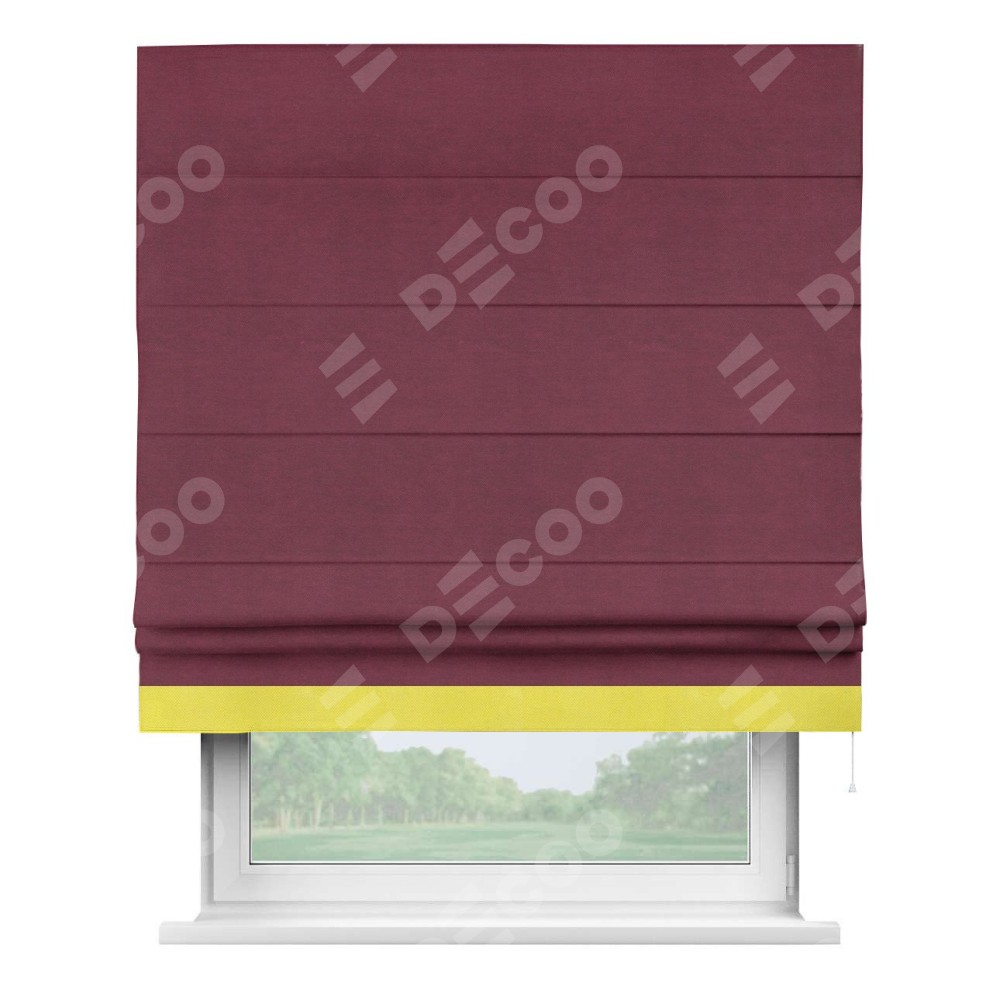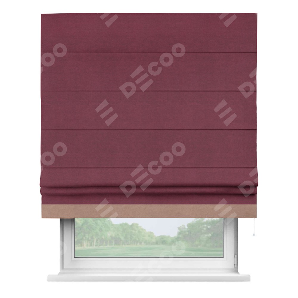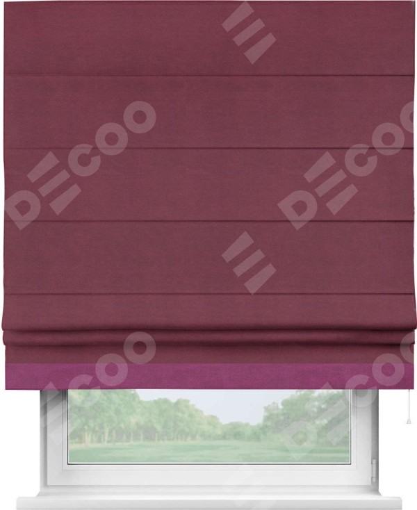 Римская штора производителя «Cortin», используется для проёма, пошита из ткани вельвет бордовый, артикул ткани 85553. Отделка шторы кантом «Джестер», ткань для канта используется из вельвета разной расцветки на выбор. Имеет универсальный механизм и подходит для монтажа: на потолок, на стену и в нишу.