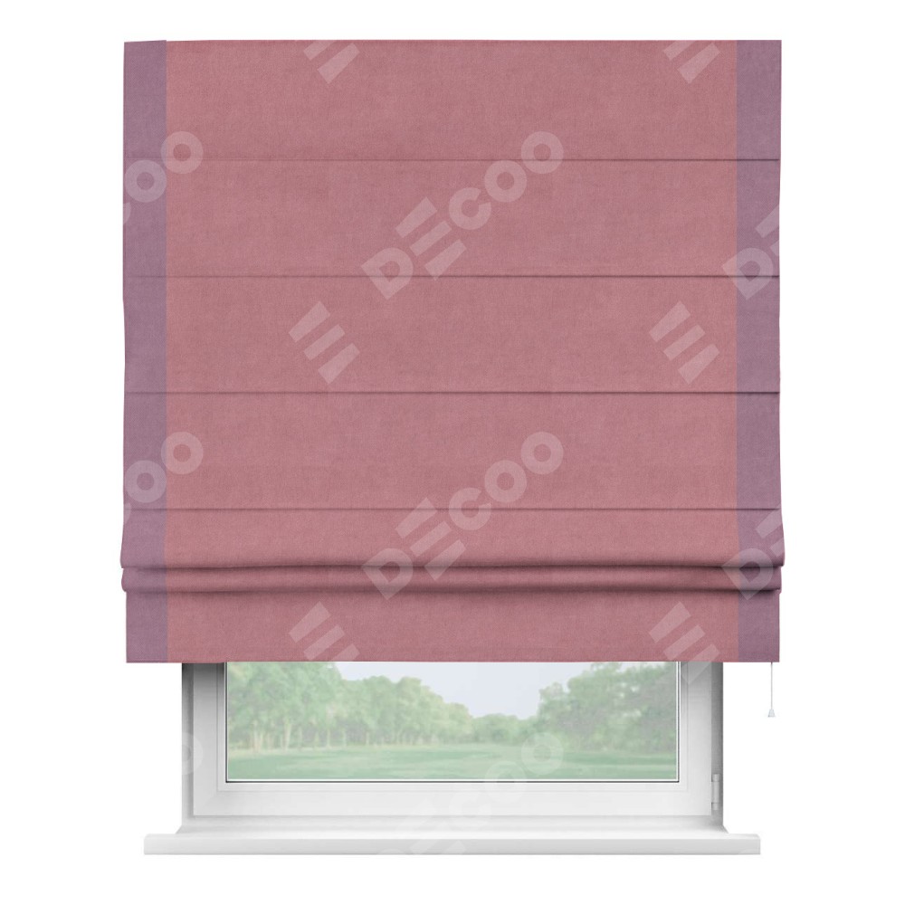 Римская штора производителя «Cortin», используется для проёма, пошита из ткани вельвет брусника, артикул ткани 85550. Отделка шторы кантом «Стрим Дуо», ткань для канта используется из вельвета разной расцветки на выбор. Имеет универсальный механизм и подходит для монтажа: на потолок, на стену и в нишу.