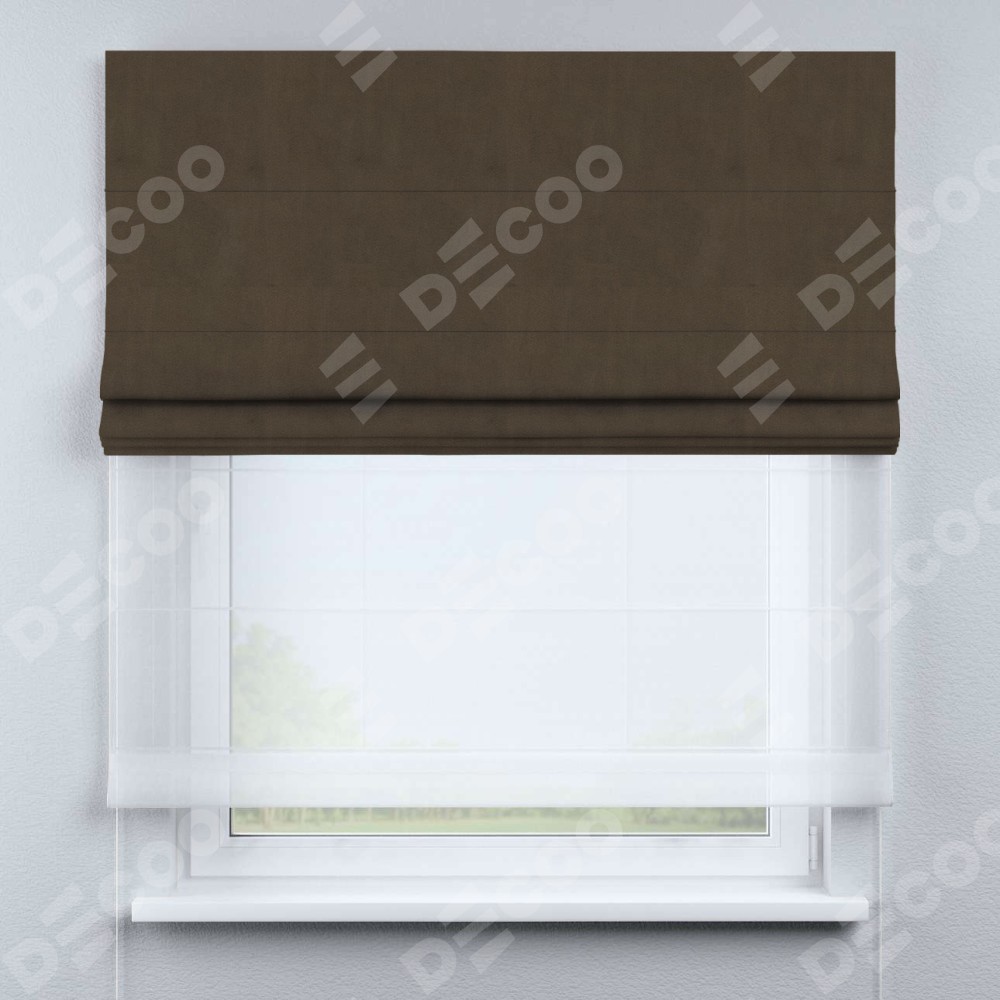 Римская штора день-ночь производителя «Cortin», используется для проёма, пошита из двух полотен, с лицевой стороны бархат тёмно-коричневый артикул 5017, вторая ткань тюль (по стандарту комплектуется тюль белого цвета артикул V-01). Имеет универсальный механизм и подходит для монтажа: на потолок, на стену и в нишу.