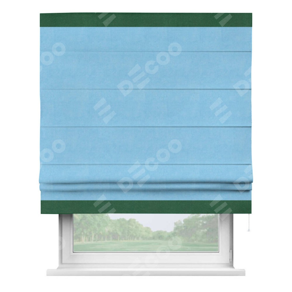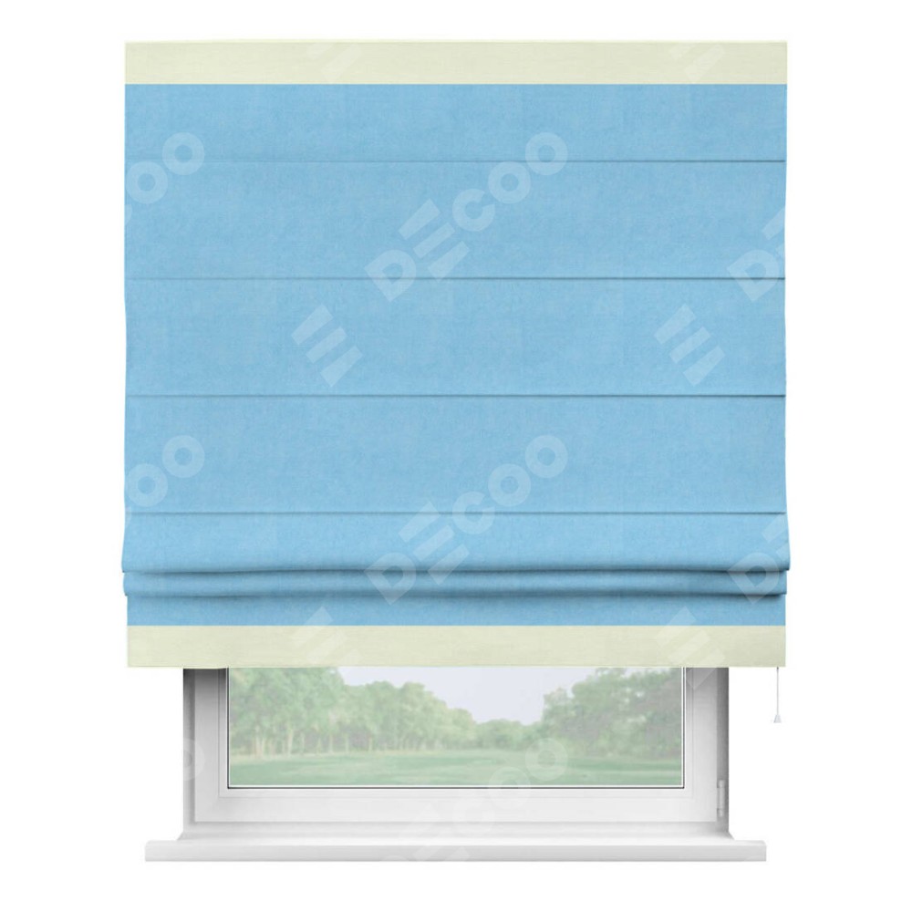 Римская штора производителя «Cortin», используется для проёма, пошита из ткани вельвет голубой, артикул ткани 85544. Отделка шторы кантом «Горизонт», ткань для канта используется из вельвета разной расцветки на выбор. Имеет универсальный механизм и подходит для монтажа: на потолок, на стену и в нишу.