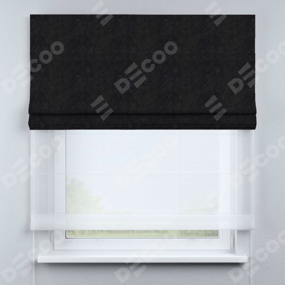 Римская штора день-ночь производителя «Cortin», используется для проёма, пошита из двух полотен, с лицевой стороны cotton блэкаут тёмно-серый артикул 35282, вторая ткань тюль (по стандарту комплектуется тюль белого цвета артикул V-01). Имеет универсальный механизм и подходит для монтажа: на потолок, на стену и в нишу.