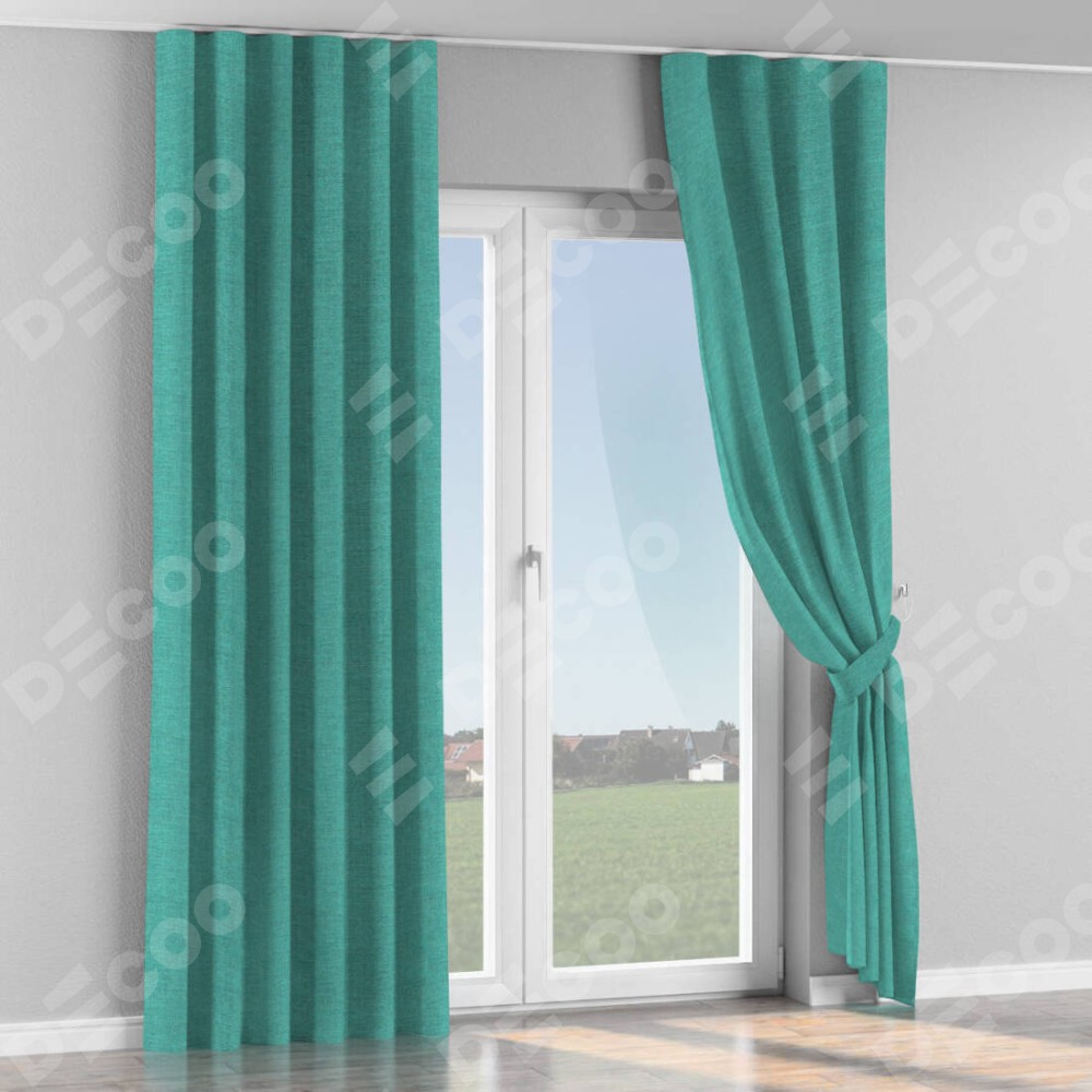Комплект прямых штор, от производителя «Cortin», пошиты из ткани лён изумрудный, артикул ткани 85908. С изнаночной стороны в верхней части штор пристрачивается шторная лента с декоративными складками «Волна». Для создания элегантных складок прямые шторы шьются по стандарту с коэффициентом 1:2 (на 100 см. ширины проёма 200 см. ширины ткани).