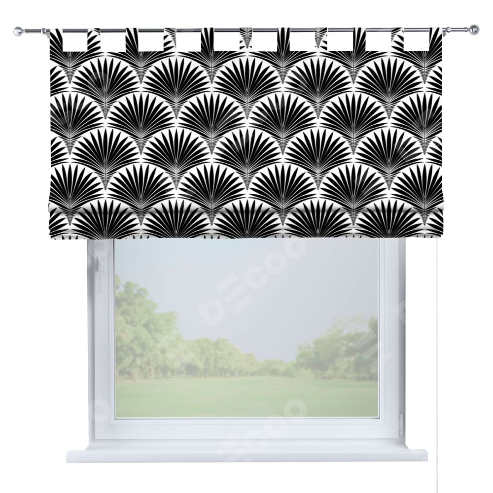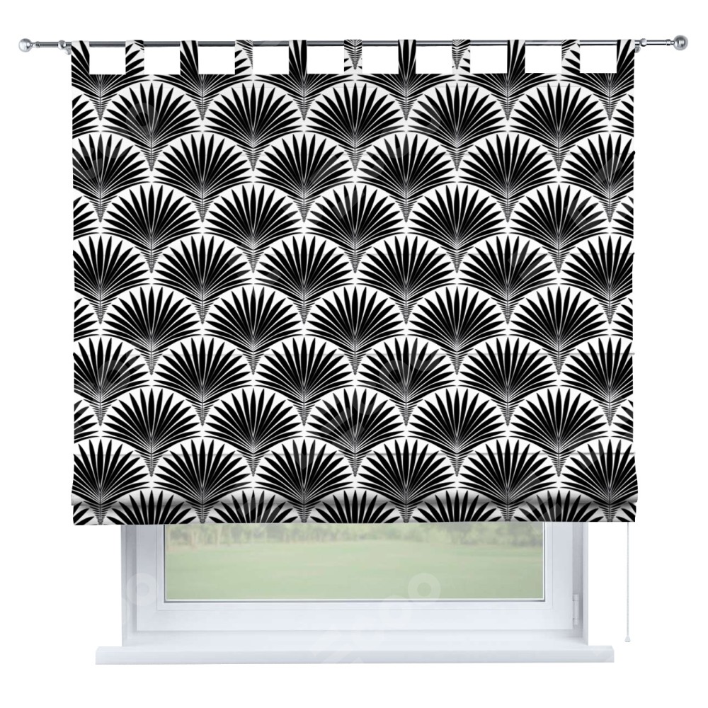 Римская штора производителя «Cortin», используется для проёма, пошита из ткани блэкаут с нанесением сублимационной печати «Арт-деко листья черный». Данная модель пошита на петлях, комплектуется на выбор круглым карнизом и подходит для монтажа на стену. Римская штора на петлях имеет простую систему регулировки высоты, отличительным преимуществом данной модели является простой способ монтажа. Достаточно повесить ее на трубу и штора готова!
