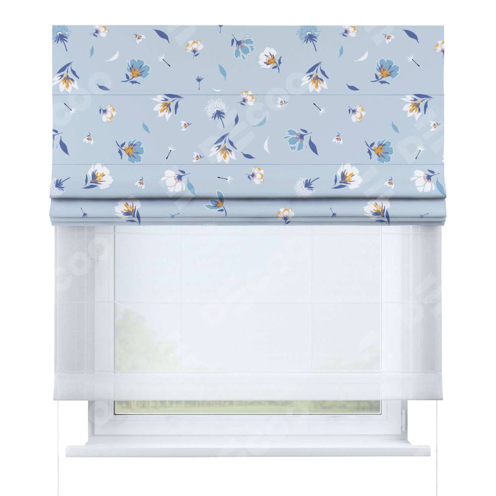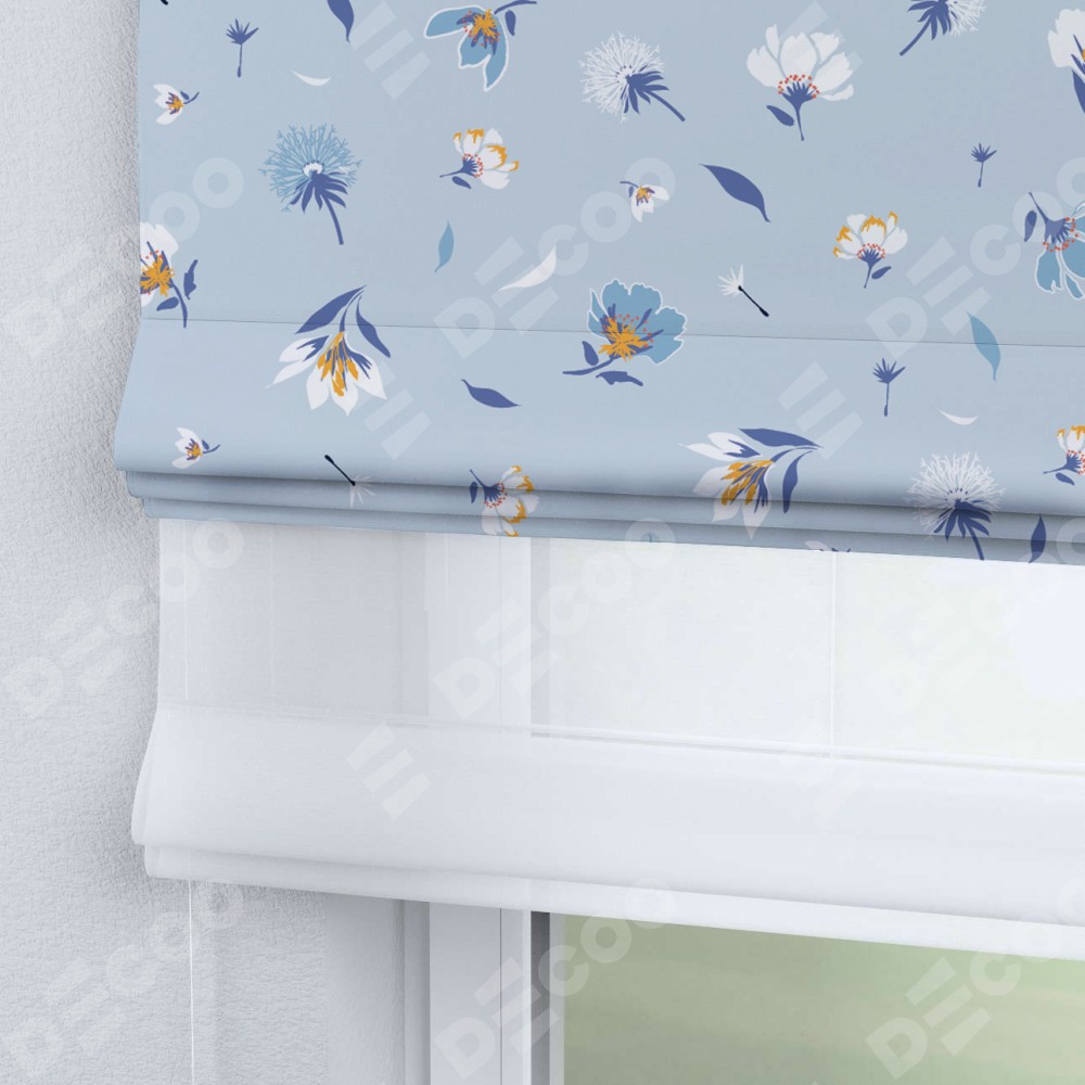 Римская штора день-ночь производителя «Cortin», используется для проёма, пошита из двух полотен, с лицевой блэкаут с нанесением сублимационной печати «Голубые цветы», вторая ткань тюль (по стандарту комплектуется тюль белого цвета артикул V-01). Имеет универсальный механизм и подходит для монтажа: на потолок, на стену и в нишу.