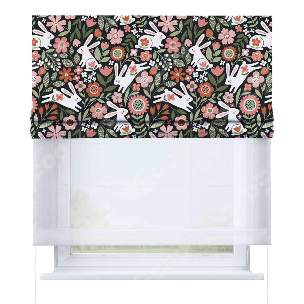 Римская штора день-ночь производителя «Cortin», используется для проёма, пошита из двух полотен, с лицевой блэкаут с нанесением сублимационной печати «Зайчики в цветнике», вторая ткань тюль (по стандарту комплектуется тюль белого цвета артикул V-01). Имеет универсальный механизм и подходит для монтажа: на потолок, на стену и в нишу.