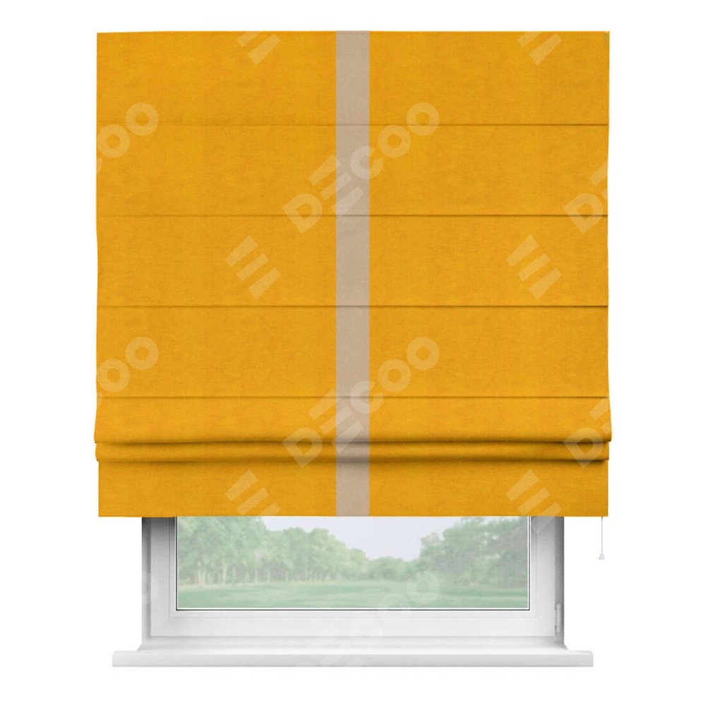 Римская штора производителя «Cortin», используется для проёма, пошита из ткани вельвет желтый, артикул ткани 85547. Отделка шторы кантом «Хайвей», ткань для канта используется из вельвета разной расцветки на выбор. Имеет универсальный механизм и подходит для монтажа: на потолок, на стену и в нишу.