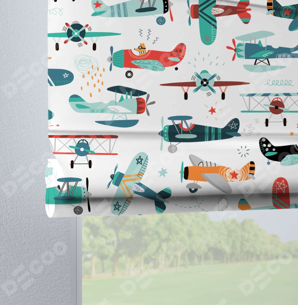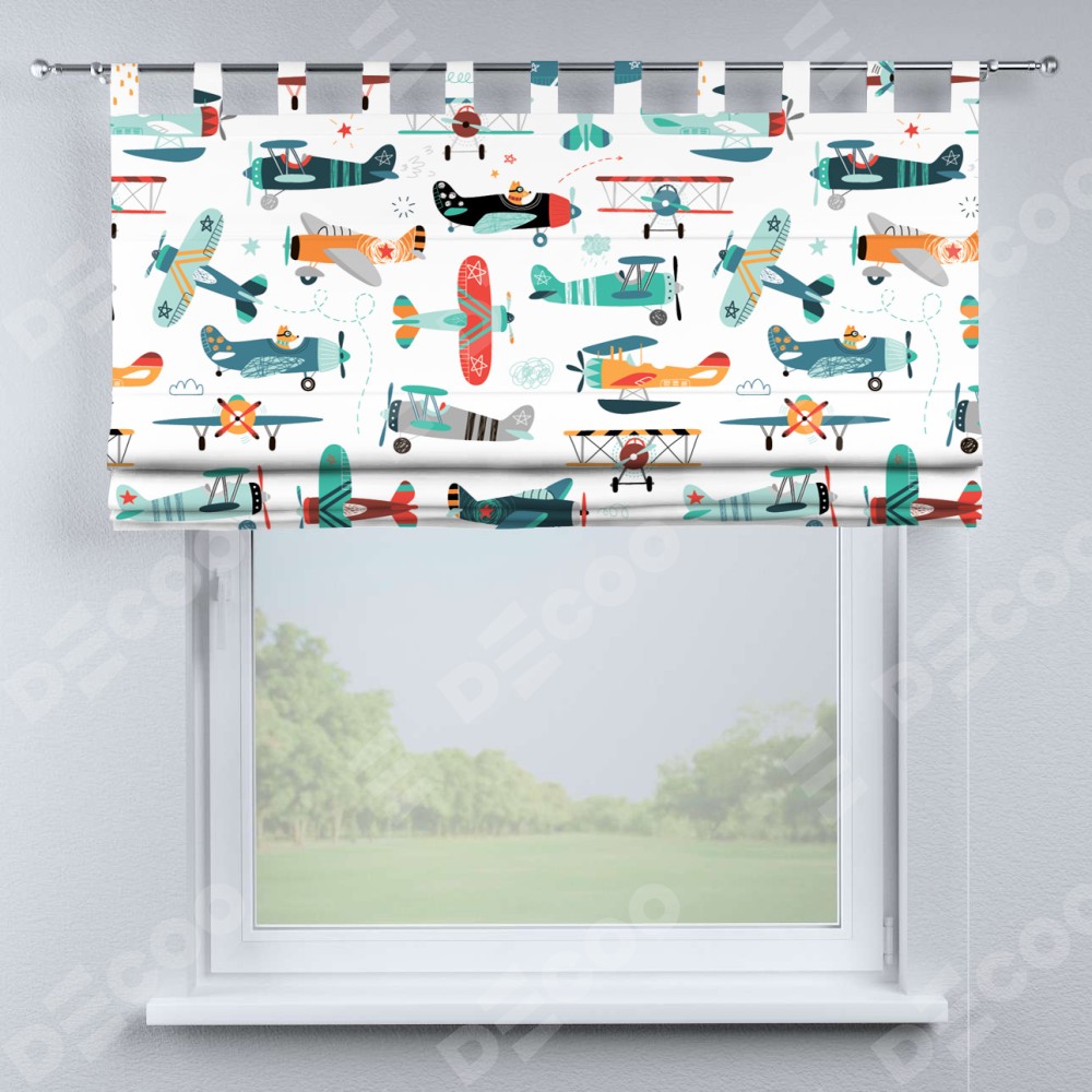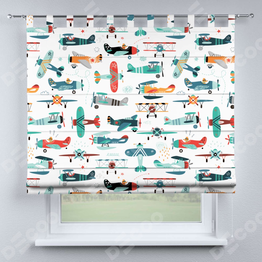 Римская штора производителя «Cortin», используется для проёма, пошита из ткани блэкаут с нанесением сублимационной печати «Самолёты и пилоты». Данная модель пошита на петлях, комплектуется на выбор круглым карнизом и подходит для монтажа на стену. Римская штора на петлях имеет простую систему регулировки высоты, отличительным преимуществом данной модели является простой способ монтажа. Достаточно повесить ее на трубу и штора готова!
