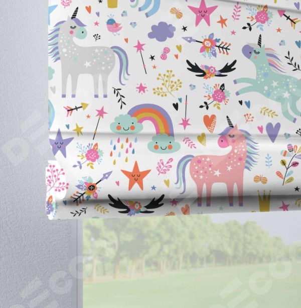 Римская штора производителя «Cortin», используется для проёма, пошита из ткани блэкаут с нанесением сублимационной печати «Радужные единороги». Данная модель пошита на петлях, комплектуется на выбор круглым карнизом и подходит для монтажа на стену. Римская штора на петлях имеет простую систему регулировки высоты, отличительным преимуществом данной модели является простой способ монтажа. Достаточно повесить ее на трубу и штора готова!