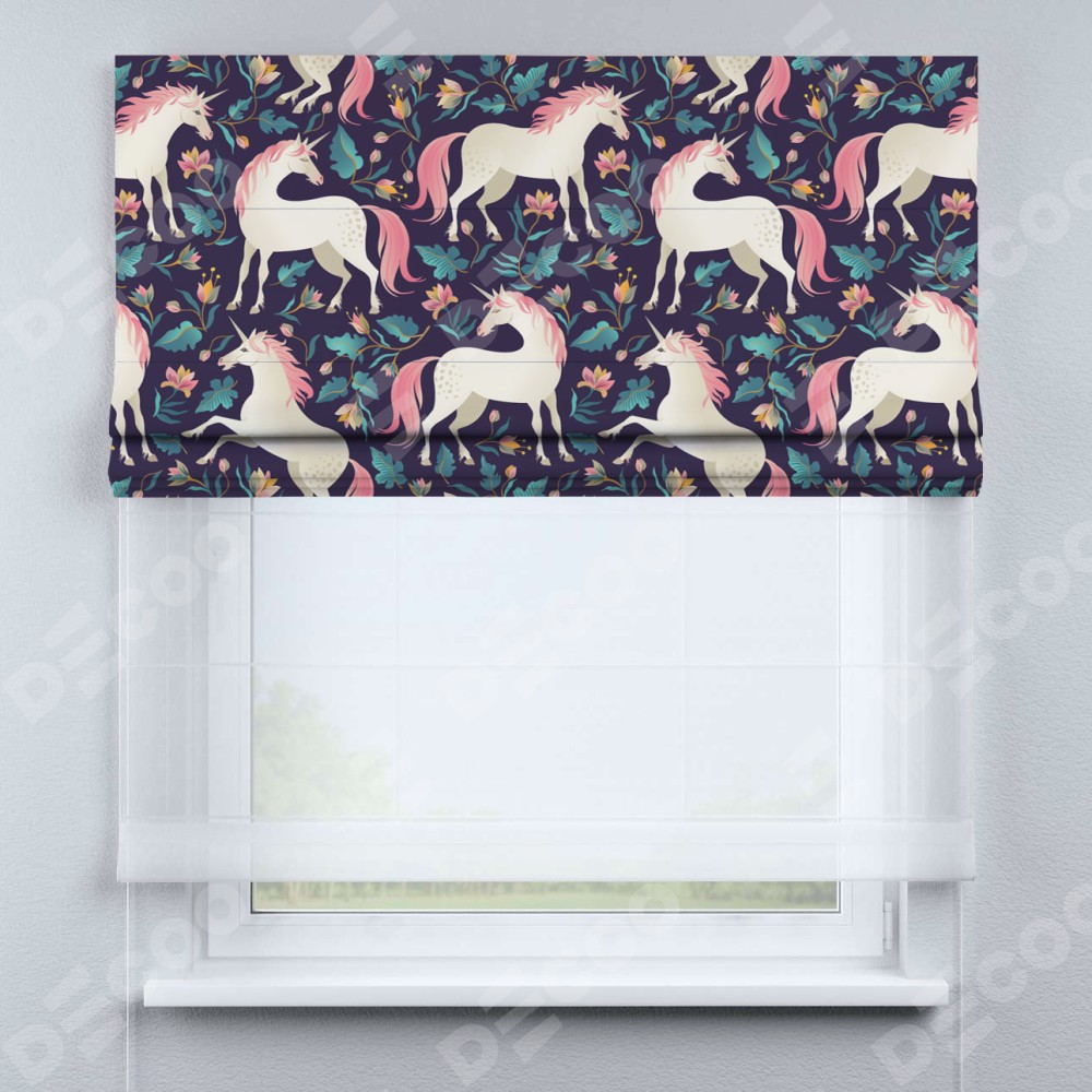 Римская штора день-ночь производителя «Cortin», используется для проёма, пошита из двух полотен, с лицевой блэкаут с нанесением сублимационной печати «Сказочные единороги», вторая ткань тюль (по стандарту комплектуется тюль белого цвета артикул V-01). Имеет универсальный механизм и подходит для монтажа: на потолок, на стену и в нишу.