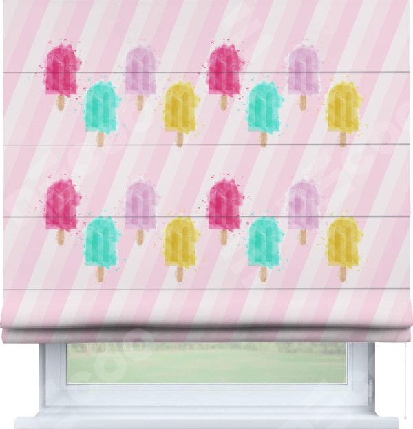 Римская штора производителя «Cortin», используется для проёма, пошита из ткани блэкаут с нанесением сублимационной печати «Фруктовое мороженое». Имеет универсальный механизм и подходит для монтажа: на потолок, на стену и в нишу.