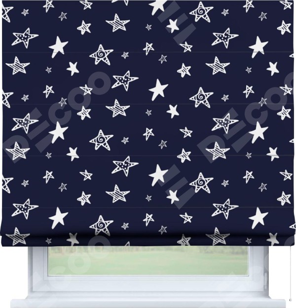 Римская штора производителя «Cortin», используется для проёма, пошита из ткани блэкаут с нанесением сублимационной печати «Ночные звёзды». Имеет универсальный механизм и подходит для монтажа: на потолок, на стену и в нишу.