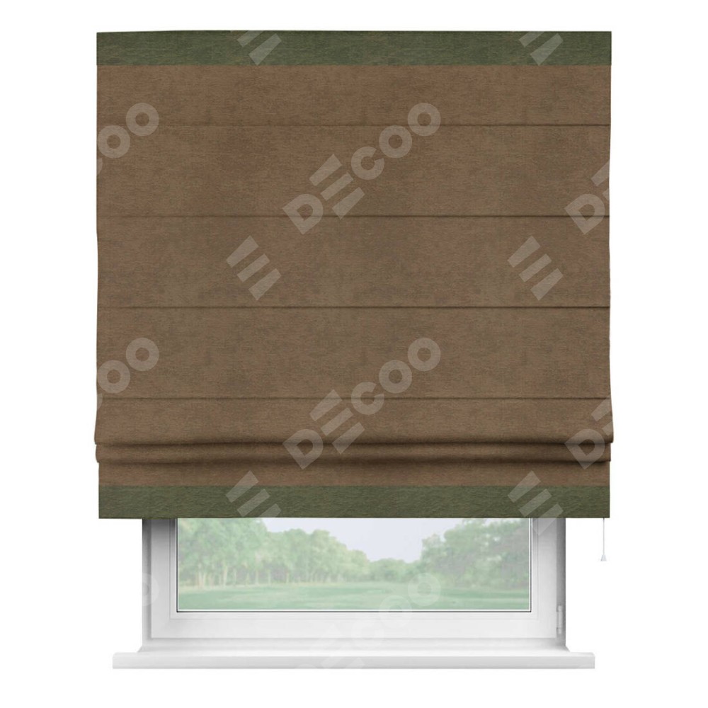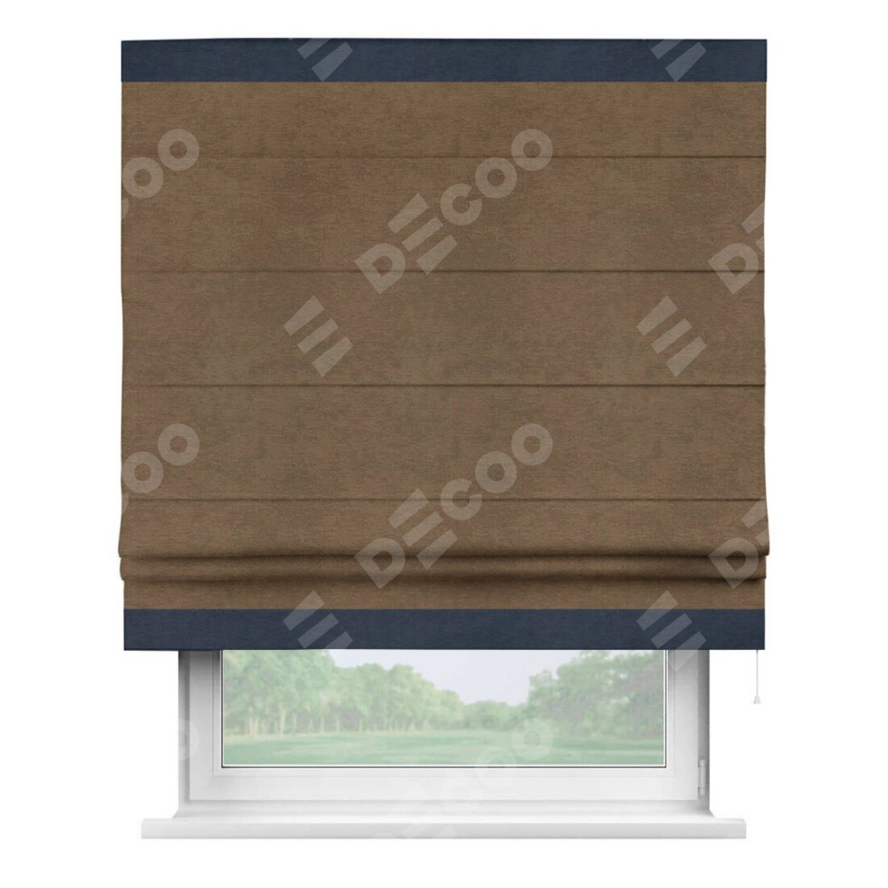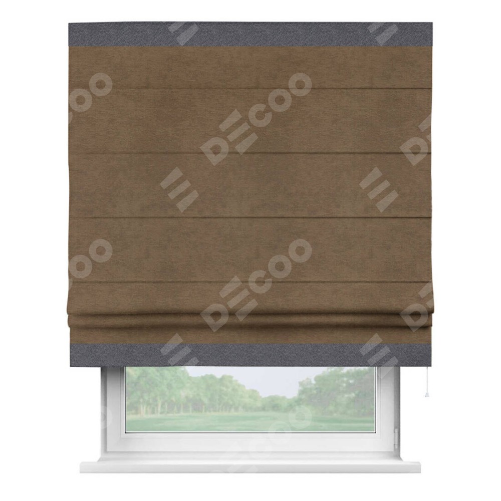 Римская штора производителя «Cortin», используется для проёма, пошита из ткани софт однотонный бронзовый, артикул 33099. Отделка шторы кантом «Горизонт», ткань для канта используется из софта разной расцветки на выбор. Имеет универсальный механизм и подходит для монтажа: на потолок, на стену и в нишу.